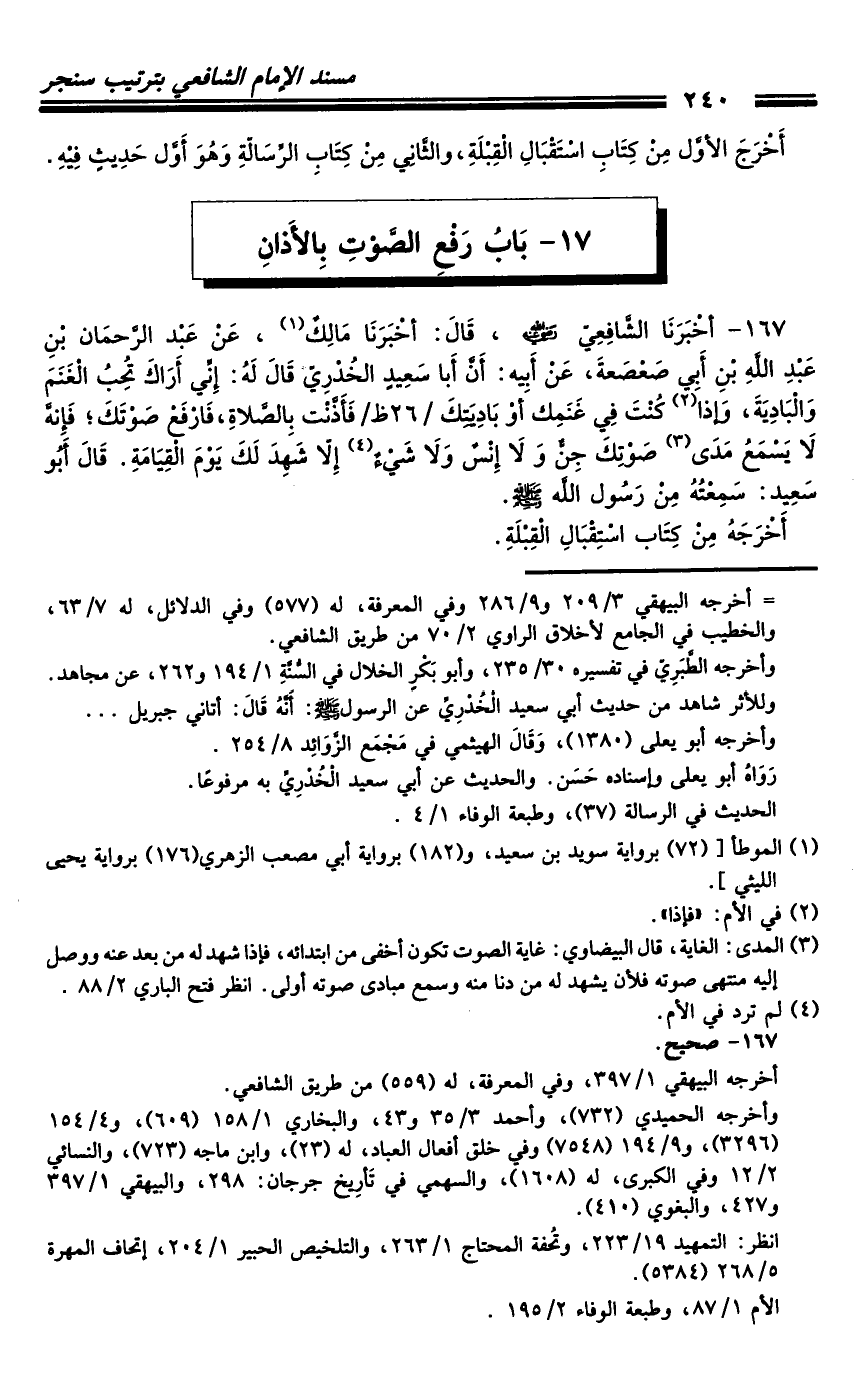 167 - أَخْبَرَنَا الشَّافِعِيُّ رَضِيَ اللَّهُ عَنْهُ، قَالَ: أَخْبَرَنَا مَالِكٌ، عَنْ عَبْدِ الرَّحْمَنِ بْنِ عَبْدِ اللَّهِ بْنِ أَبِي صَعْصَعَةَ، عَنْ أَبِيهِ: أَنَّ أَبَا سَعِيدٍ الْخُدْرِيِّ قَالَ لَهُ: إِنِّي أَرَاكَ تُحِبُّ الْغَنَمَ وَالْبَادِيَةَ، وَإِذَا كُنْتَ فِي غَنَمِكَ أَوْ بَادِيَتِكَ فَأَذَّنْتَ بِالصَّلاةِ، فَارْفَعْ صَوْتَكَ، فَإِنَّهُ لا يَسْمَعُ مَدَى صَوْتِكَ جِنٌّ وَلا إِنْسٌ وَلا شَيْءٌ إِلا شَهِدَ لَكَ يَوْمَ الْقِيَامَةِ.