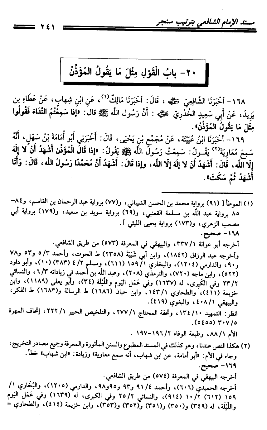 168 - أَخْبَرَنَا الشَّافِعِيُّ رَضِيَ اللَّهُ عَنْهُ، قَالَ: أَخْبَرَنَا مَالِكٌ، عَنِ ابْنِ شِهَابٍ، عَنْ عَطَاءِ بْنِ يَزِيدَ، عَنْ أَبِي سَعِيدٍ الْخُدْرِيِّ رَضِيَ اللَّهُ عَنْهُ: أَنَّ رَسُولَ اللَّهِ صَلَّى اللَّهُ عَلَيْهِ وَسَلَّمَ قَالَ: «إِذَا سَمِعْتُمُ النِّدَاءَ فَقُولُوا مِثْلَ مَا يَقُولُ الْمُؤَذِّنُ» .