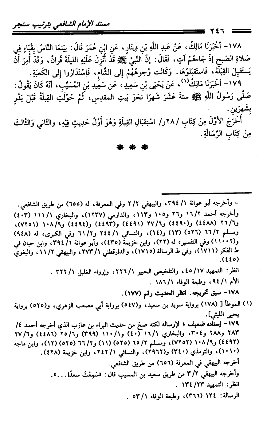 178 - أَخْبَرَنَا مَالِكٌ، عَنْ عَبْدِ اللَّهِ بْنِ دِينَارٍ، عَنِ ابْنِ عُمَرَ، قَالَ: بَيْنَمَا النَّاسُ بِقُبَاءٍ فِي صَلاةِ الصُّبْحِ إِذْ جَاءَهُمْ آتٍ، فَقَالَ: إِنَّ النَّبِيَّ صَلَّى اللَّهُ عَلَيْهِ وَسَلَّمَ قَدْ أُنْزِلَ عَلَيْهِ اللَّيْلَةَ قُرْآنٌ، وَقَدْ أُمِرَ أَنْ يَسْتَقْبِلَ الْقِبْلَةَ، فَاسْتَقْبَلُوهَا.