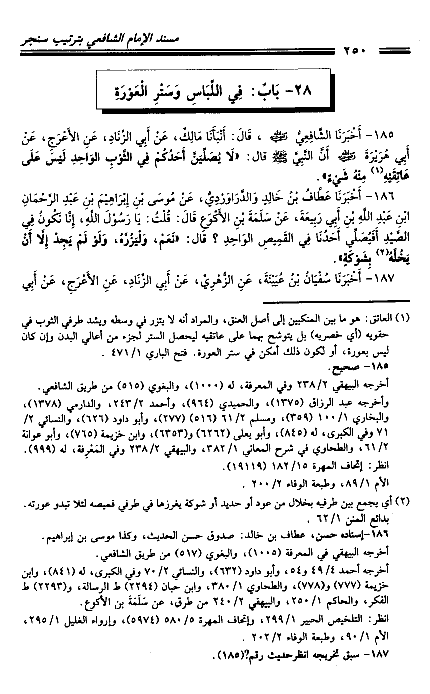 185 - أَخْبَرَنَا الشَّافِعِيُّ رَضِيَ اللَّهُ عَنْهُ، قَالَ: أَنْبَأَنَا مَالِكٌ، عَنْ أَبِي الزِّنادِ، عَنِ الأَعْرَجِ، عَنْ أَبِي هُرَيْرَةَ رَضِيَ اللَّهُ عَنْهُ، أَنَّ النَّبِيَّ صَلَّى اللَّهُ عَلَيْهِ وَسَلَّمَ قَالَ: «لا يُصَلِّيَنَّ أَحَدُكُمْ فِي الثَّوْبِ الْوَاحِدِ لَيْسَ عَلَى عَاتِقَيْهِ مِنْهُ شَيْءٌ» .