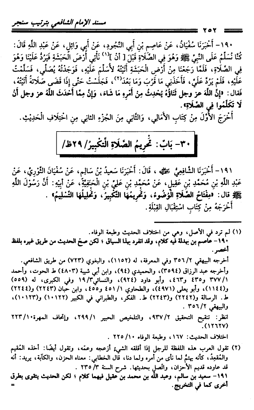 190 - أَخْبَرَنَا سُفْيَانُ، عَنْ عَاصِمِ بْنِ أَبِي النَّجُودِ، عَنْ أَبِي وَائِلٍ، عَنْ عَبْدِ اللَّهِ، قَالَ: كُنَّا نُسَلِّمُ عَلَى النَّبِيِّ صَلَّى اللَّهُ عَلَيْهِ وَسَلَّمَ وَهُوَ فِي الصَّلاةِ قَبْلَ أَنْ نَأْتِيَ أَرْضَ الْحَبَشَةِ فَيَرُدُّ عَلَيْنَا وَهُوَ فِي الصَّلاةِ فَلَمَّا رَجَعْنَا مِنْ أَرْضِ الْحَبَشَةِ أَتَيْتُهُ لأُسَلِّمَ عَلَيْهِ، فَوَجَدْتُهُ يُصَلِّي، فَسَلَّمْتُ عَلَيْهِ، فَلَمْ يَرُدَّ عَلَيَّ، فَأَخَذَنِي مَا قَرُبَ وَمَا بَعُدَ، فَجَلَسْتُ حَتَّى إِذَا قَضَى صَلاتَهُ أَتَيْتُهُ، فَقَالَ: «إِنَّ اللَّهَ عَزَّ وَجَلَّ ثَنَاؤُهُ يُحْدِثُ مِنْ أَمْرِهِ مَا شَاءَ، وَإِنَّ مِمَّا أَحْدَثَ اللَّهُ عَزَّ وَجَلَّ أَنْ لا تَكَلَّمُوا فِي الصَّلاةِ» .