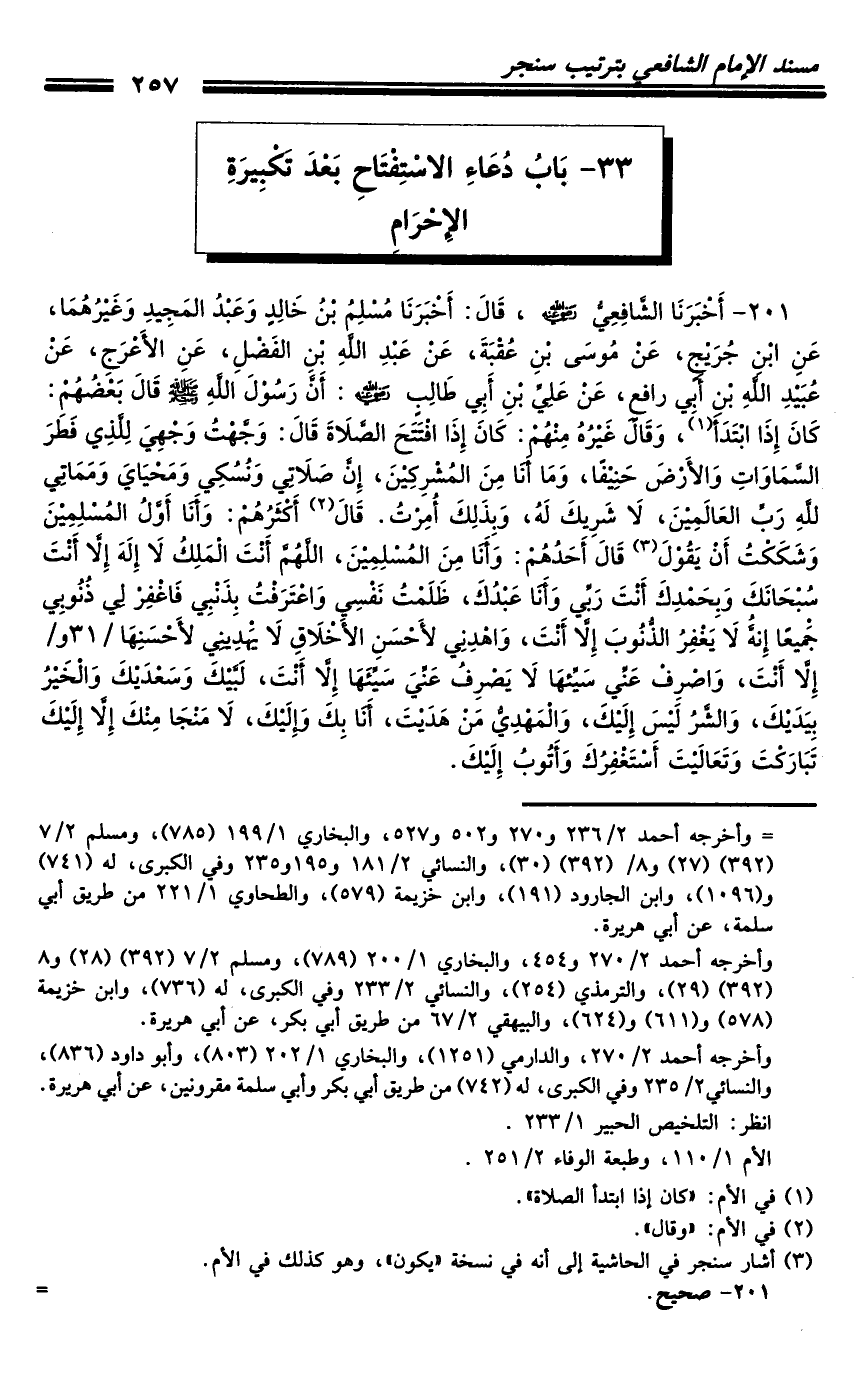 201 - أَخْبَرَنَا الشَّافِعِيُّ رَضِيَ اللَّهُ عَنْهُ، قَالَ: أَخْبَرَنَا مُسْلِمُ بْنُ خَالِدٍ، وَعَبْدُ الْمَجِيدِ وَغَيْرُهُمَا، عَنِ ابْنِ جُرَيْجٍ، عَنْ مُوسَى بْنِ عُقْبَةَ، عَنْ عَبْدِ اللَّهِ بْنِ الْفَضْلِ، عَنِ الأَعْرَجِ، عَنْ عُبَيْدِ اللَّهِ بْنِ أَبِي رَافِعٍ، عَنْ عَلِيِّ بْنِ أَبِي طَالِبٍ رَضِيَ اللَّهُ عَنْهُ: أَنَّ رَسُولَ اللَّهِ صَلَّى اللَّهُ عَلَيْهِ وَسَلَّمَ قَالَ بَعْضُهُمْ: كَانَ إِذَا ابْتَدَأَ، وَقَالَ غَيْرُهُ مِنْهُمْ: كَانَ إِذَا افْتَتَحَ الصَّلاةَ قَالَ: وَجَّهْتُ وَجْهِيَ لِلَّذِي فَطَرَ السَّمَوَاتِ وَالأَرْضَ حَنِيفًا، وَمَا أَنَا مِنَ الْمُشْرِكِينَ، إِنَّ صَلاتِي وَنُسُكِي وَمَحْيَايَ وَمَمَاتِي للَّهِ رَبِّ الْعَالَمِينَ، لا شَرِيكَ لَهُ، وَبِذَلِكَ أُمِرْتُ.
