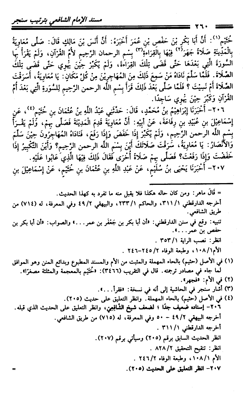 206 - أَخْبَرَنَا إِبْرَاهِيمُ بْنُ مُحَمَّدٍ، قَالَ: حَدَّثَنِي عَبْدُ اللَّهِ بْنُ عُثْمَانَ بْنِ خُثَيْمٍ، عَنْ إِسْمَاعِيلَ بْنِ عُبَيْدِ بْنِ رِفَاعَةَ، عَنْ أَبِيهِ أَنَّ مُعَاوِيَةَ قَدِمَ الْمَدِينَةَ فَصَلَّى بِهِمْ، وَلَمْ يَقْرَأْ {بِسْمِ اللَّهِ الرَّحْمَنِ الرَّحِيمِ} [الفاتحة: 1] ، وَلَمْ يُكَبِّرْ إِذَا خَفَضَ وَإِذَا رَفَعَ، فَنَادَاهُ الْمُهَاجِرُونَ حِينَ سَلَّمَ وَالأَنْصَارُ: يَا مُعَاوِيَةُ، سَرَقْتَ صَلاتَكَ أَيْنَ {بِسْمِ اللَّهِ الرَّحْمَنِ الرَّحِيمِ} [الفاتحة: 1] ؟ وَأَيْنَ التَّكْبِيرَ إِذَا خَفَضْتَ وَإِذَا رَفَعْتَ؟ فَصَلَّى بِهِمْ صَلاةً أُخْرَى، فَقَالَ: ذَلِكَ فِيهَا الَّذِي عَابُوا عَلَيْهِ.