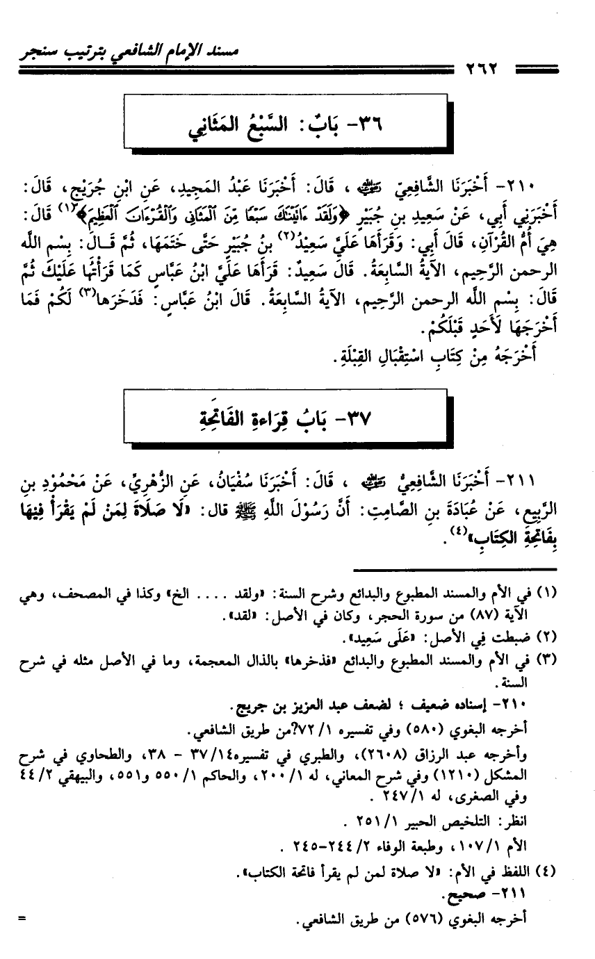 210 - أَخْبَرَنَا الشَّافِعِيُّ رَضِيَ اللَّهُ عَنْهُ، قَالَ: أَخْبَرَنَا عَبْدُ الْمَجِيدِ، عَنِ ابْنِ جُرَيْجٍ، قَالَ: أَخْبَرَنِي أَبِي، عَنْ سَعِيدِ بْنِ جُبَيْرٍ {وَلَقَدْ آتَيْنَاكَ سَبْعًا مِنَ الْمَثَانِي وَالْقُرْءَانَ الْعَظِيمَ} [الحجر: 87] قَالَ: هِيَ أُمُّ الْقُرْآنِ، قَالَ أَبِي: وَقَرَأَهَا عَلَيَّ سَعِيدُ بْنُ جُبَيْرٍ حَتَّى خَتَمَهَا، ثُمَّ قَالَ: {بِسْمِ اللَّهِ الرَّحْمَنِ الرَّحِيمِ} [الفاتحة: 1] الآيَةُ السَّابِعَةُ.