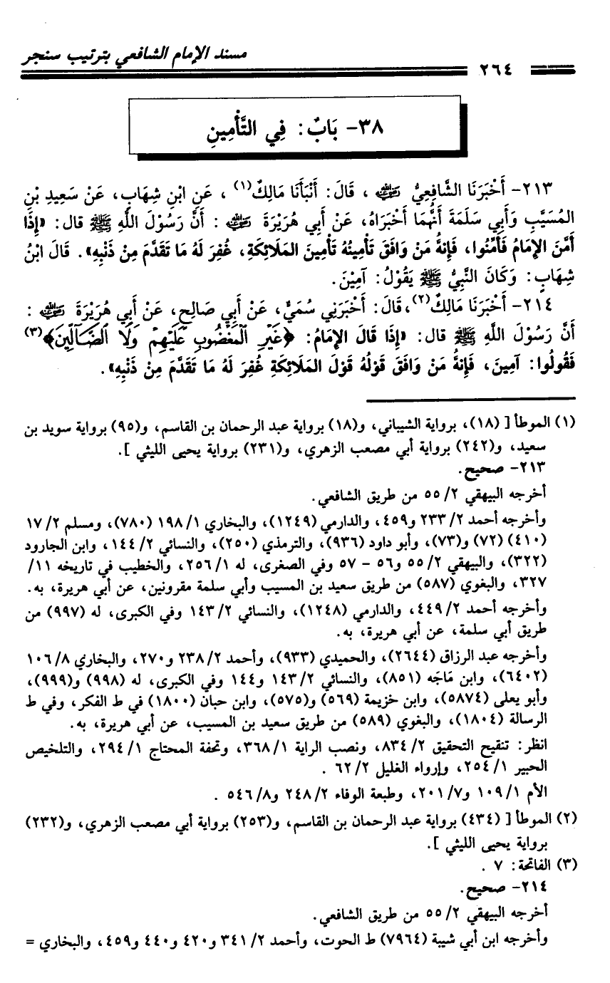 213 - أَخْبَرَنَا الشَّافِعِيُّ رَضِيَ اللَّهُ عَنْهُ، قَالَ: أَنْبَأَنَا مَالِكٌ، عَنِ ابْنِ شِهَابٍ، عَنْ سَعِيدِ بْنِ الْمُسَيِّبِ، وَأَبِي سَلَمَةَ أَنَّهُمَا أَخْبَرَاهُ، عَنْ أَبِي هُرَيْرَةَ رَضِيَ اللَّهُ عَنْهُ: أَنَّ رَسُولَ اللَّهِ صَلَّى اللَّهُ عَلَيْهِ وَسَلَّمَ قَالَ: «إِذَا أَمَّنَ الإِمَامُ فَأَمِّنُوا، فَإِنَّهُ مَنْ وَافَقَ تَأْمِينُهُ تَأْمِينَ الْمَلائِكَةِ، غُفِرَ لَهُ مَا تَقَدَّمَ مِنْ ذَنْبِهِ» .