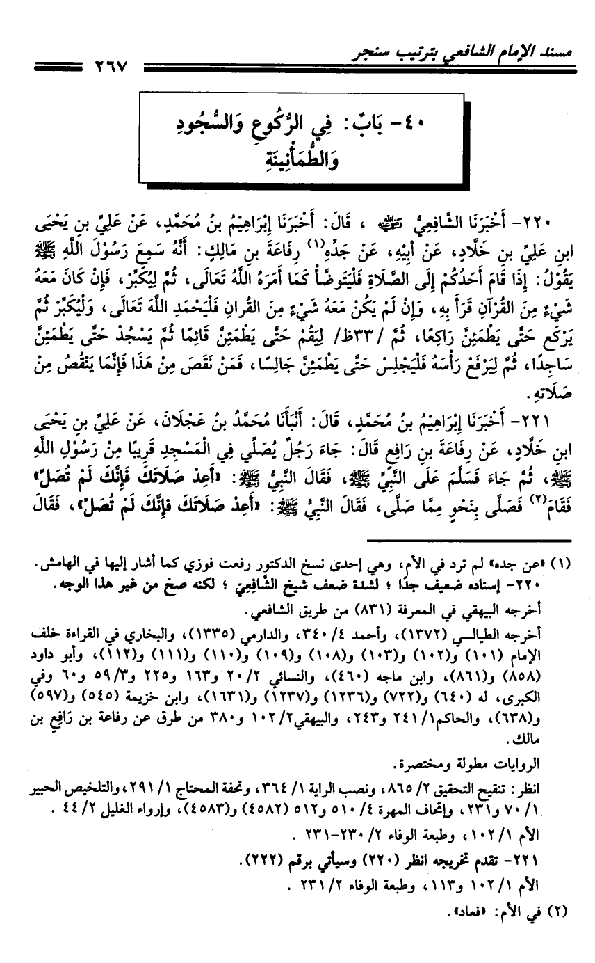 220 - أَخْبَرَنَا الشَّافِعِيُّ رَضِيَ اللَّهُ عَنْهُ، قَالَ: أَخْبَرَنَا إِبْرَاهِيمُ بْنُ مُحَمَّدٍ، عَنْ عَلِيِّ بْنِ يَحْيَى بْنِ عَلِيِّ بْنِ خَلادٍ، عَنْ أَبِيهِ، عَنْ جَدِّهِ رِفَاعَةَ بْنِ مَالِكٍ: أَنَّهُ سَمِعَ رَسُولَ اللَّهِ صَلَّى اللَّهُ عَلَيْهِ وَسَلَّمَ يَقُولُ: " إِذَا قَامَ أَحَدُكُمْ إِلَى الصَّلاةِ فَلْيَتَوَضَّأْ كَمَا أَمَرَهُ اللَّهُ تَعَالَى، ثُمَّ لِيُكَبِّرْ، فَإِنْ كَانَ مَعَهُ شَيْءٌ مِنَ الْقُرْآنِ قَرَأَ بِهِ، وَإِنْ لَمْ يَكُنْ مَعَهُ شَيْءٌ مِنَ الْقُرْآنِ فَلْيَحْمَدِ اللَّهَ تَعَالَى، وَلْيُكَبِّرْ ثُمَّ يَرْكَعْ حَتَّى يَطْمَئِنَّ رَاكِعًا، ثُمَّ لِيَقُمْ حَتَّى يَطْمَئِنَّ قَائِمًا ثُمَّ يَسْجُدْ حَتَّى يَطْمَئِنَّ سَاجِدًا، ثُمَّ لِيَرْفَعْ رَأْسَهُ فَلْيَجْلِسْ حَتَّى يَطْمَئِنَّ جَالِسًا، فَمَنْ نَقَصَ مِنْ هَذَا فَإِنَّمَا يَنْقُصُ مِنْ صَلاتِهِ.