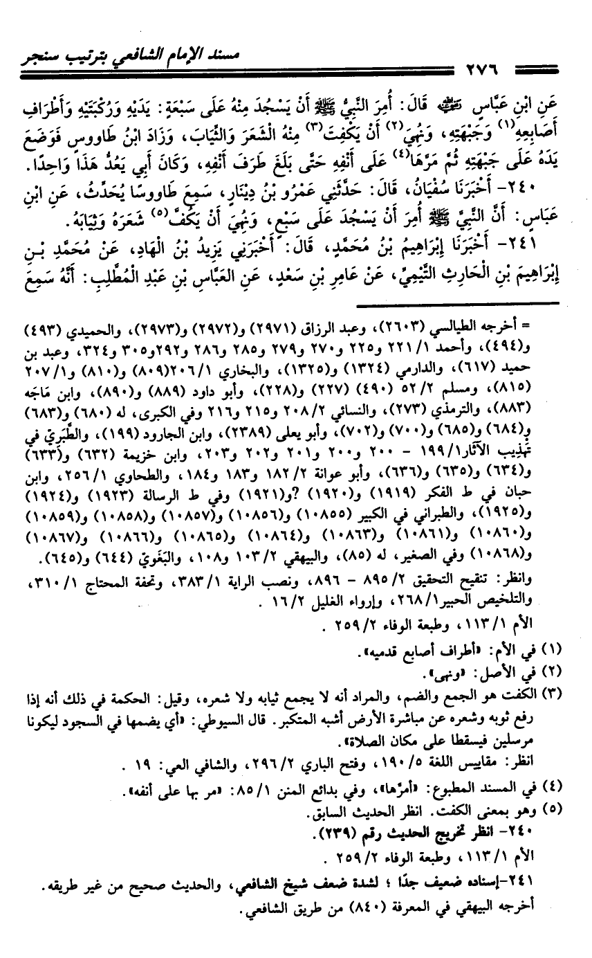 240 - أَخْبَرَنَا سُفْيَانُ، قَالَ: حَدَّثَنِي عَمْرُو بْنُ دِينَارٍ، سَمِعَ طَاوُسًا يُحَدِّثُ، عَنِ ابْنِ عَبَّاسٍ: أَنَّ النَّبِيَّ صَلَّى اللَّهُ عَلَيْهِ وَسَلَّمَ أُمِرَ أَنْ يَسْجُدَ عَلَى سَبْعٍ، وَنُهِيَ أَنْ يَكُفَّ شَعْرَهُ وَثِيَابَهُ.