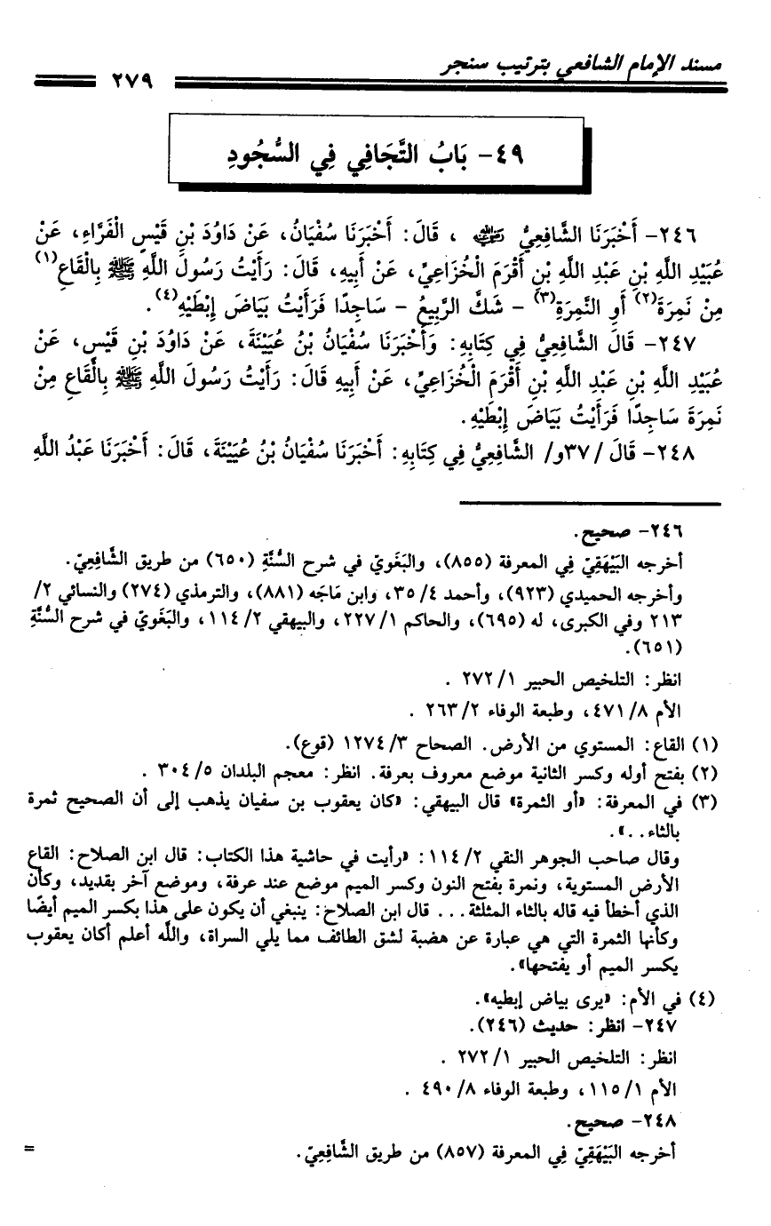 246 - أَخْبَرَنَا الشَّافِعِيُّ رَضِيَ اللَّهُ عَنْهُ، قَالَ: أَخْبَرَنَا سُفْيَانُ، عَنْ دَاوُدَ بْنِ قَيْسٍ الْفَرَّاءِ، عَنْ عُبَيْدِ اللَّهِ بْنِ عَبْدِ اللَّهِ بْنِ أَقْرَمَ الْخُزَاعِيِّ، عَنْ أَبِيهِ، قَالَ: رَأَيْتُ رَسُولَ اللَّهِ صَلَّى اللَّهُ عَلَيْهِ وَسَلَّمَ بِالْقَاعِ مِنْ نَمِرَةَ أَوِ النَّمِرَةِ شَكَّ الرَّبِيعُ سَاجِدًا فَرَأَيْتُ بَيَاضَ إِبْطَيْهِ.