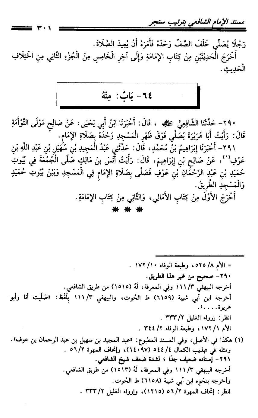 290 - حَدَّثَنَا الشَّافِعِيُّ رَضِيَ اللَّهُ عَنْهُ، قَالَ: أَخْبَرَنَا ابْنُ أَبِي يَحْيَى، عَنْ صَالِحٍ مَوْلَى التَّوْءَمَةِ قَالَ: رَأَيْتُ أَبَا هُرَيْرَةَ يُصَلِّي فَوْقَ ظَهْرِ الْمَسْجِدِ وَحْدَهُ بِصَلاةِ الإِمَامِ.