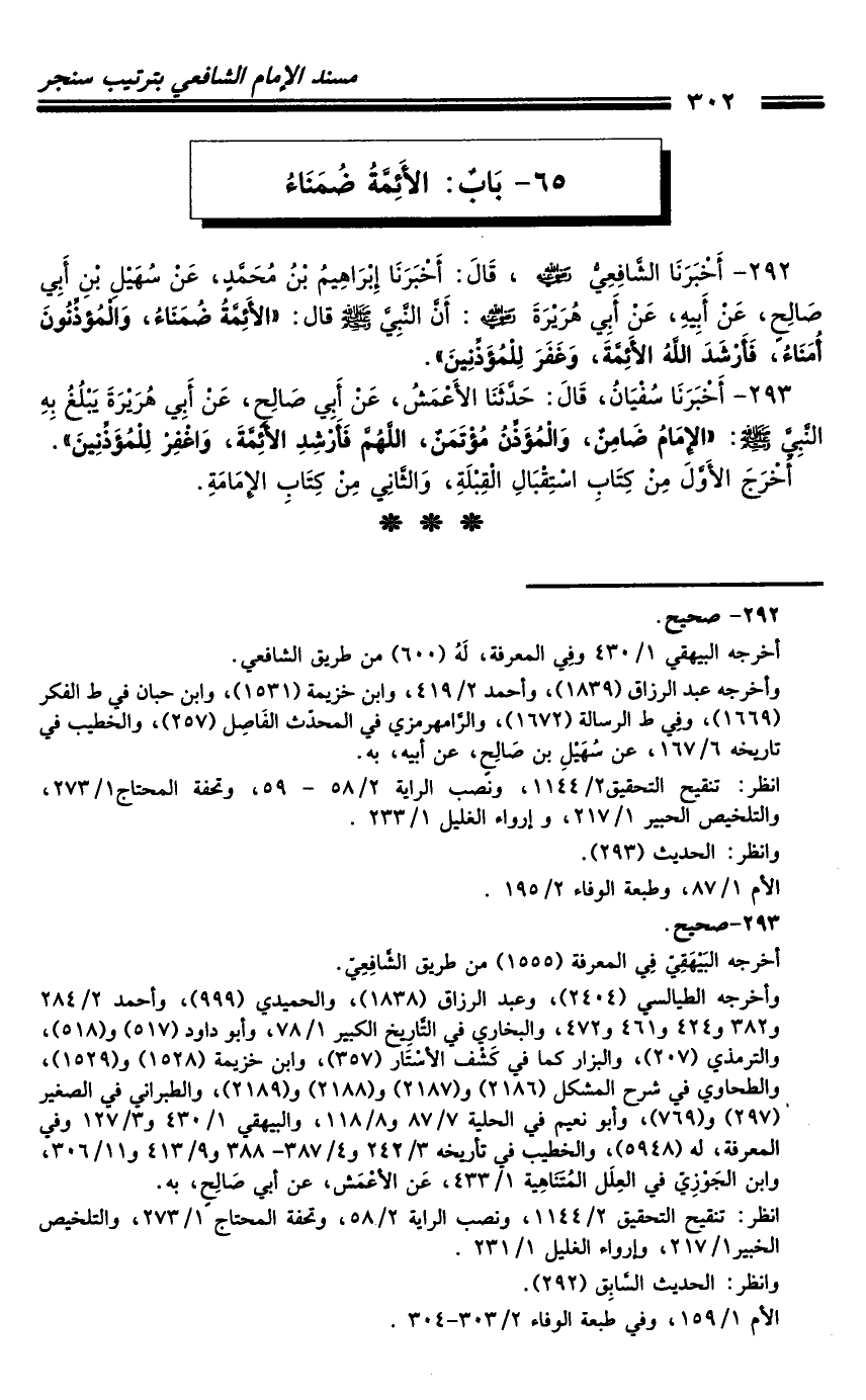 292 - أَخْبَرَنَا الشَّافِعِيُّ رَضِيَ اللَّهُ عَنْهُ، قَالَ: أَخْبَرَنَا إِبْرَاهِيمُ بْنُ مُحَمَّدٍ، عَنْ سُهَيْلِ بْنِ أَبِي صَالِحٍ، عَنْ أَبِيهِ، عَنْ أَبِي هُرَيْرَةَ رَضِيَ اللَّهُ عَنْهُ: أَنَّ النَّبِيَّ صَلَّى اللَّهُ عَلَيْهِ وَسَلَّمَ قَالَ: الأَئِمَّةُ ضُمَنَاءُ، وَالْمُؤَذِّنُونَ أُمَنَاءُ، فَأَرْشَدَ اللَّهُ الأَئِمَّةَ، وَغَفَرَ لِلْمُؤَذِّنِينَ ".