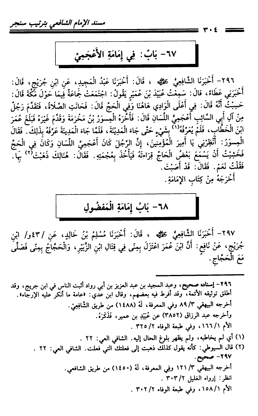 296 - أَخْبَرَنَا الشَّافِعِيُّ رَضِيَ اللَّهُ عَنْهُ، قَالَ: أَخْبَرَنَا عَبْدُ الْمَجِيدِ، عَنِ ابْنِ جُرَيْجٍ، قَالَ: أَخْبَرَنِي عَطَاءٌ، قَالَ: سَمِعْتُ عُبَيْدُ بْنُ عُمَيْرٍ، يَقُولُ: اجْتَمَعَتْ جَمَاعَةٌ فِيمَا حَوْلَ مَكَّةَ قَالَ: حَسِبْتُ أَنَّهُ قَالَ: فِي أَعْلَى الْوَادِي هَهُنَا وَفِي الْحَجِّ قَالَ: فَحَانَتِ الصَّلاةُ، فَتَقَدَّمَ رَجُلٌ مِنْ آلِ أَبِي السَّائِبِ أَعْجَمِيُّ اللِّسَانِ قَالَ: فَأَخَّرَهُ الْمِسْوَرُ بْنُ مَخْرَمَةَ وَقَدَّمَ غَيْرَهُ فَبَلَغَ عُمَرَ بْنَ الْخَطَّابِ، فَلَمْ يَعْرِفْهُ بِشَيْءٍ حَتَّى جَاءَ الْمَدِينَةَ، فَلَمَّا جَاءَ الْمَدِينَةَ عَرَفَهُ بِذَلِكَ.