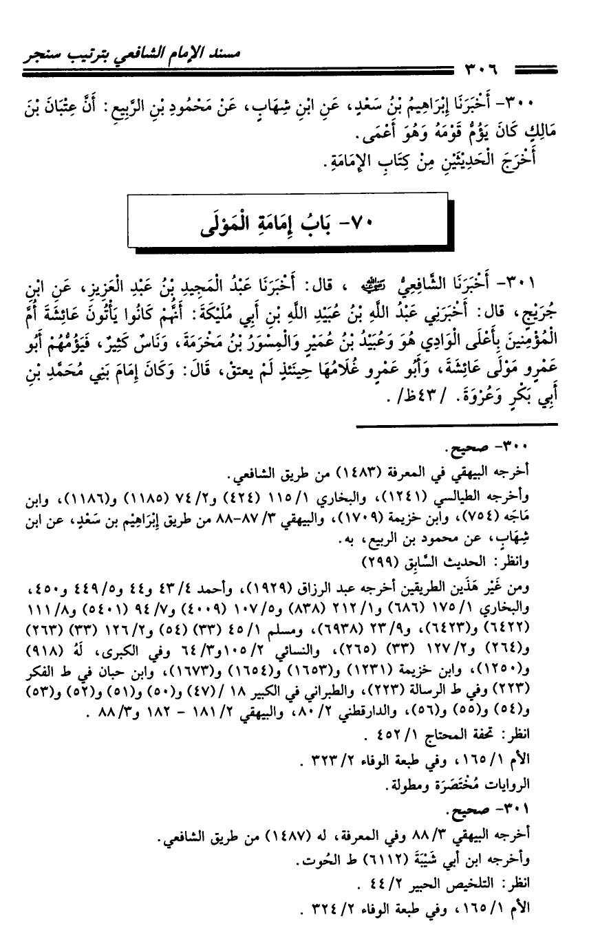 301 - أَخْبَرَنَا الشَّافِعِيُّ رَضِيَ اللَّهُ عَنْهُ، قَالَ: أَخْبَرَنَا عَبْدُ الْمَجِيدِ بْنُ عَبْدِ الْعَزِيزِ، عَنِ ابْنِ جُرَيْجٍ قَالَ: أَخْبَرَنِي عَبْدُ اللَّهِ بْنُ عُبَيْدِ اللَّهِ بْنِ أَبِي مُلَيْكَةَ: أَنَّهُمْ كَانُوا يَأْتُونَ عَائِشَةَ أُمَّ الْمُؤْمِنِينَ بِأَعْلَى الْوَادِي هُوَ وَعُبَيْدُ بْنُ عُمَيْرٍ وَالْمِسْوَرُ بْنُ مَخْرَمَةَ، وَنَاسٌ كَثِيرٌ، فَيَؤُمُّهُمْ أَبُو عَمْرٍو مَوْلَى عَائِشَةَ، وَأَبُو عَمْرٍو غُلامُهَا حِينَئِذٍ لَمْ يُعْتَقْ، قَالَ: وَكَانَ إِمَامَ بَنِي مُحَمَّدِ بْنِ أَبِي بَكْرٍ وَعُرْوَةَ.