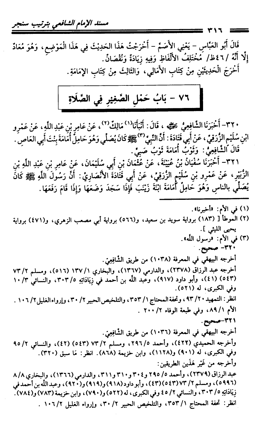 320 - أَخْبَرَنَا الشَّافِعِيُّ رَضِيَ اللَّهُ عَنْهُ، قَالَ: أَنْبَأَنَا مَالِكٌ، عَنْ عَامِرِ بْنِ عَبْدِ اللَّهِ، عَنْ عَمْرِو بْنِ سُلَيْمٍ الزُّرَقِيِّ، عَنْ أَبِي قَتَادَةَ: أَنَّ النَّبِيَّ صَلَّى اللَّهُ عَلَيْهِ وَسَلَّمَ كَانَ يُصَلِّي وَهُوَ حَامِلٌ أُمَامَةَ بِنْتَ أَبِي الْعَاصِ.