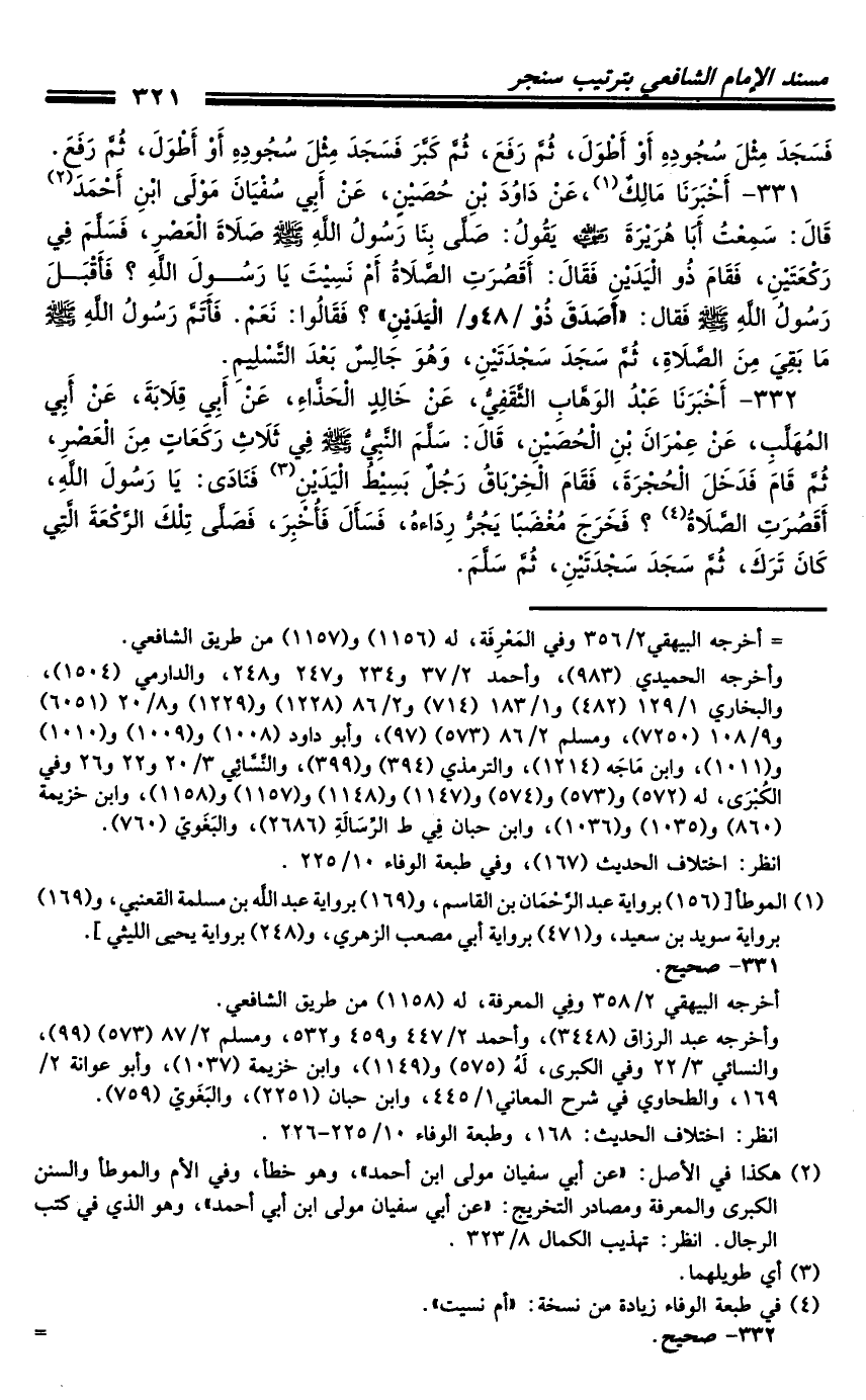 331 - أَخْبَرَنَا مَالِكٌ، عَنْ دَاوُدَ بْنِ حُصَيْنٍ، عَنْ أَبِي سُفْيَانَ مَوْلَى ابْنِ أَحْمَدَ، قَالَ: سَمِعْتُ أَبَا هُرَيْرَةَ رَضِيَ اللَّهُ عَنْهُ، يَقُولُ: صَلَّى بِنَا رَسُولُ اللَّهِ صَلَّى اللَّهُ عَلَيْهِ وَسَلَّمَ صَلاةَ الْعَصْرِ، فَسَلَّمَ فِي رَكْعَتَيْنِ، فَقَامَ ذُو الْيَدَيْنِ، فَقَالَ: أَقَصُرَتِ الصَّلاةُ أَمْ نَسِيتَ يَا رَسُولَ اللَّهِ؟ فَأَقْبَلَ رَسُولُ اللَّهِ صَلَّى اللَّهُ عَلَيْهِ وَسَلَّمَ فَقَالَ: «أَصَدَقَ ذُو الْيَدَيْنِ» ؟ فَقَالُوا: نَعَمْ.