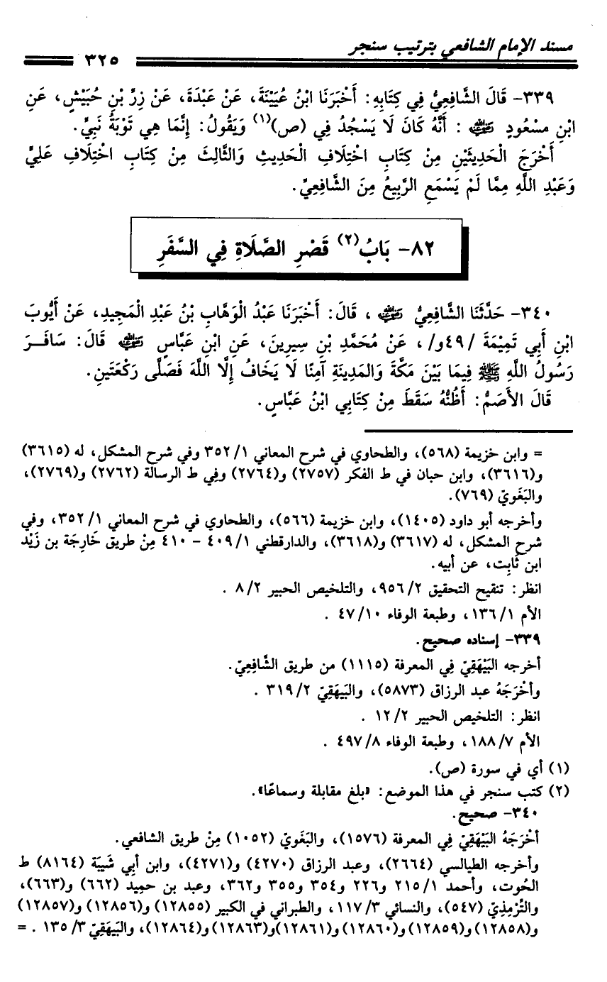 340 - أَخْبَرَنَا الشَّافِعِيُّ رَضِيَ اللَّهُ عَنْهُ، قَالَ: أَخْبَرَنَا عَبْدُ الْوَهَّابِ بْنُ عَبْدِ الْمَجِيدِ، عَنْ أَيُّوبَ بْنِ أَبِي تَمِيمَةَ، عَنْ مُحَمَّدِ بْنِ سِيرِينَ، عَنِ ابْنِ عَبَّاسٍ رَضِيَ اللَّهُ عَنْهُ قَالَ: سَافَرَ رَسُولُ اللَّهِ صَلَّى اللَّهُ عَلَيْهِ وَسَلَّمَ فِيمَا بَيْنَ مَكَّةَ وَالْمَدِينَةِ آمِنًا لا يَخَافُ إِلا اللَّهَ فَصَلَّى رَكْعَتَيْنِ.