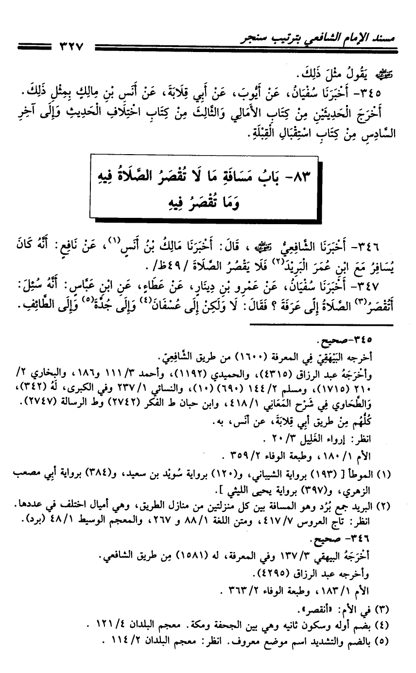 346 - أَخْبَرَنَا الشَّافِعِيُّ رَضِيَ اللَّهُ عَنْهُ، قَالَ: أَخْبَرَنَا مَالِكُ بْنُ أَنَسٍ، عَنْ نَافِعٍ: أَنَّهُ كَانَ يُسَافِرُ مَعَ ابْنِ عُمَرَ الْبَرِيدَ فَلا يَقْصُرُ الصَّلاةَ.