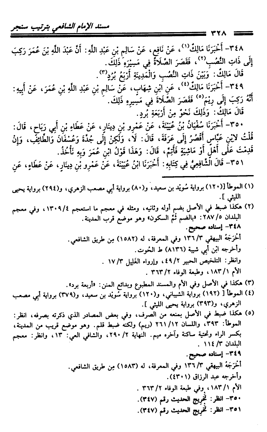 348 - أَخْبَرَنَا مَالِكٌ، عَنْ نَافِعٍ، عَنْ سَالِمِ بْنِ عَبْدِ اللَّهِ: أَنَّ عَبْدَ اللَّهِ بْنَ عُمَرَ رَكِبَ إِلَى ذَاتِ النَّصَبِ، فَقَصَرَ الصَّلاةَ فِي مَسِيرَةِ ذَلِكَ.