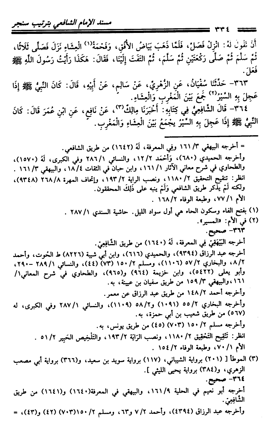 364 - قَالَ الشَّافِعِيُّ فِي كِتَابِهِ: أَخْبَرَنَا مَالِكٌ، عَنْ نَافِعٍ، عَنِ ابْنِ عُمَرَ، قَالَ: كَانَ النَّبِيُّ صَلَّى اللَّهُ عَلَيْهِ وَسَلَّمَ إِذَا عَجِلَ بِهِ السَّيْرُ يَجْمَعُ بَيْنَ الْعِشَاءِ وَالْمَغْرِبِ.