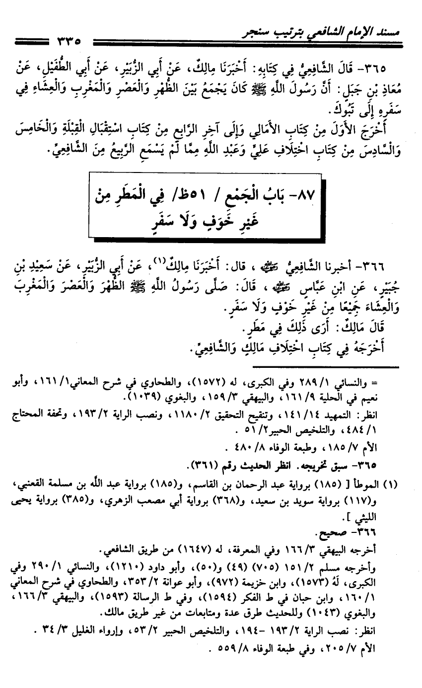 365 - قَالَ الشَّافِعِيُّ فِي كِتَابِهِ: أَخْبَرَنَا مَالِكٌ، عَنْ أَبِي الزُّبَيْرِ، عَنْ أَبِي الطُّفَيْلِ، عَنْ مُعَاذِ بْنِ جَبَلٍ، أَنَّ رَسُولَ اللَّهِ صَلَّى اللَّهُ عَلَيْهِ وَسَلَّمَ كَانَ يَجْمَعُ بَيْنَ الظُّهْرِ وَالْعَصْرِ وَالْمَغْرِبِ وَالْعِشَاءِ فِي سَفَرِهِ إِلَى تَبُوكَ.