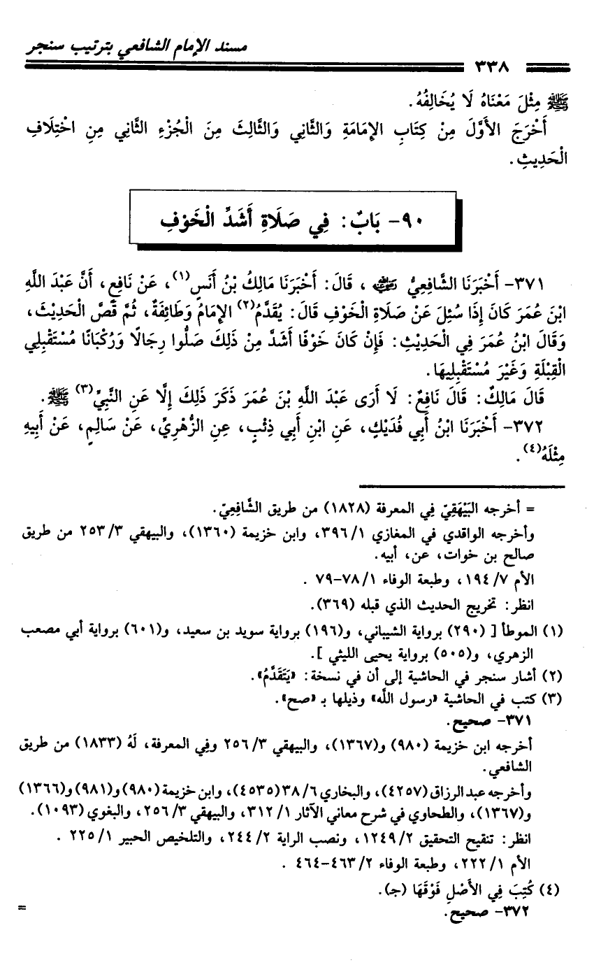 371 - أَخْبَرَنَا الشَّافِعِيُّ رَضِيَ اللَّهُ عَنْهُ، قَالَ: أَخْبَرَنَا مَالِكُ بْنُ أَنَسٍ، عَنْ نَافِعٍ، أَنَّ عَبْدَ اللَّهِ بْنَ عُمَرَ كَانَ إِذَا سُئِلَ عَنْ صَلاةِ الْخَوْفِ، قَالَ: يُقَدَّمُ الإِمَامُ وَطَائِفَةٌ، ثُمَّ قَصَّ الْحَدِيثَ، وَقَالَ ابْنُ عُمَرَ فِي الْحَدِيثِ: فَإِنْ كَانَ خَوْفًا أَشَدَّ مِنْ ذَلِكَ صَلَّوْا رِجَالا وَرُكْبَانًا مُسْتَقْبِلِي الْقِبْلَةِ وَغَيْرَ مُسْتَقْبِلِيهَا.