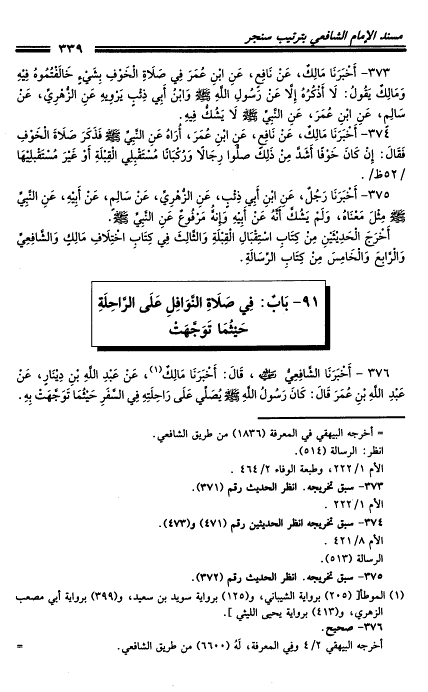 376 - أَخْبَرَنَا الشَّافِعِيُّ رَضِيَ اللَّهُ عَنْهُ، قَالَ: أَخْبَرَنَا مَالِكٌ، عَنْ عَبْدِ اللَّهِ بْنِ دِينَارٍ، عَنْ عَبْدِ اللَّهِ بْنِ عُمَرَ، قَالَ: كَانَ رَسُولُ اللَّهِ صَلَّى اللَّهُ عَلَيْهِ وَسَلَّمَ يُصَلِّي عَلَى رَاحِلَتِهِ فِي السَّفَرِ حَيْثُمَا تَوَجَّهَتْ بِهِ.