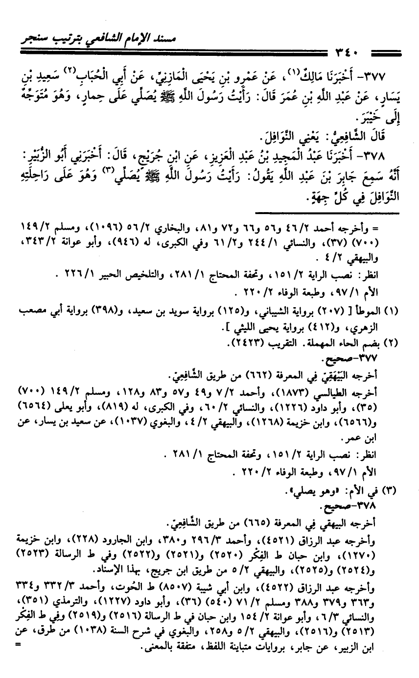 377 - أَخْبَرَنَا مَالِكٌ، عَنْ عَمْرِو بْنِ يَحْيَى الْمَازِنِيِّ، عَنْ أَبِي الْحُبَابِ سَعِيدِ بْنِ يَسَارٍ، عَنْ عَبْدِ اللَّهِ بْنِ عُمَرَ، قَالَ: رَأَيْتُ رَسُولَ اللَّهِ صَلَّى اللَّهُ عَلَيْهِ وَسَلَّمَ يُصَلِّي عَلَى حِمَارٍ، وَهُوَ مُتَوَجِّهٌ إِلَى خَيْبَرَ.