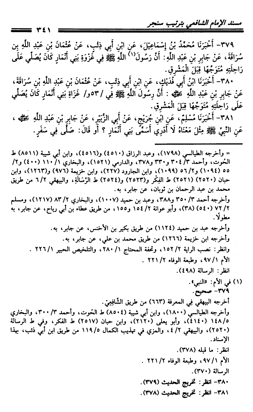 379 - أَخْبَرَنَا مُحَمَّدُ بْنُ إِسْمَاعِيلَ، عَنِ ابْنِ أَبِي ذِئْبٍ، عَنْ عُثْمَانَ بْنِ عَبْدِ اللَّهِ بْنِ سُرَاقَةَ، عَنْ جَابِرِ بْنِ عَبْدِ اللَّهِ: أَنَّ رَسُولَ اللَّهِ صَلَّى اللَّهُ عَلَيْهِ وَسَلَّمَ فِي غَزْوَةِ بَنِي أَنْمَارٍ كَانَ يُصَلِّي عَلَى رَاحِلَتِهِ مُتَوَجِّهًا قِبَلَ الْمَشْرِقِ.