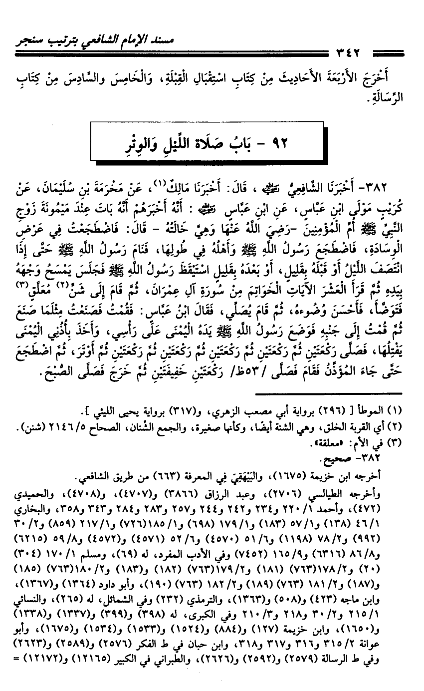 382 - أَخْبَرَنَا الشَّافِعِيُّ رَضِيَ اللَّهُ عَنْهُ، قَالَ: أَخْبَرَنَا مَالِكٌ، عَنْ مَخْرَمَةَ بْنِ سُلَيْمَانَ، عَنْ كُرَيْبٍ مَوْلَى ابْنِ عَبَّاسٍ، عَنِ ابْنِ عَبَّاسٍ رَضِيَ اللَّهُ عَنْهُ: أَنَّهُ أَخْبَرَهُمْ أَنَّهُ بَاتَ عِنْدَ مَيْمُونَةَ زَوْجِ النَّبِيِّ صَلَّى اللَّهُ عَلَيْهِ وَسَلَّمَ أُمِّ الْمُؤْمِنِينَ رَضِيَ اللَّهُ عَنْهَا وَهِيَ خَالَتُهُ، قَالَ: فَاضْطَجَعْتُ فِي عَرْضِ الْوِسَادَةِ، فَاضْطَجَعَ رَسُولُ اللَّهِ صَلَّى اللَّهُ عَلَيْهِ وَسَلَّمَ وَأَهْلُهُ فِي طُولِهَا، فَنَامَ رَسُولُ اللَّهِ صَلَّى اللَّهُ عَلَيْهِ وَسَلَّمَ حَتَّى إِذَا انْتَصَفَ اللَّيْلُ أَوْ قَبْلَهُ بِقَلِيلٍ، أَوْ بَعْدَهُ بِقَلِيلٍ اسْتَيْقَظَ رَسُولُ اللَّهِ صَلَّى اللَّهُ عَلَيْهِ وَسَلَّمَ فَجَلَسَ يَمْسَحُ وَجْهَهُ بِيَدِهِ ثُمَّ قَرَأَ الْعَشْرَ الآيَاتِ الْخَوَاتِمَ مِنْ سُورَةِ آلِ عِمْرَانَ، ثُمَّ قَامَ إِلَى شَنٍّ مُعَلَّقٍ فَتَوَضَّأَ، فَأَحْسَنَ وُضُوءَهُ، ثُمَّ قَامَ يُصَلِّي، فَقَالَ ابْنُ عَبَّاسٍ: فَقُمْتُ فَصَنَعْتُ مِثْلَمَا صَنَعَ ثُمَّ قُمْتُ إِلَى جَنْبِهِ فَوَضَعَ رَسُولُ اللَّهِ صَلَّى اللَّهُ عَلَيْهِ وَسَلَّمَ يَدَهُ الْيُمْنَى عَلَى رَأْسِي، وَأَخَذَ بِأُذُنِي الْيُمْنَى يَفْتِلُهَا، فَصَلَّى رَكْعَتَيْنِ ثُمَّ رَكْعَتَيْنِ ثُمَّ رَكْعَتَيْنِ ثُمَّ رَكْعَتَيْنِ ثُمَّ رَكْعَتَيْنِ ثُمَّ أَوْتَرَ، ثُمَّ اضْطَجَعَ حَتَّى جَاءَ الْمُؤَذِّنُ فَقَامَ فَصَلَّى رَكْعَتَيْنِ خَفِيفَتَيْنِ ثُمَّ خَرَجَ فَصَلَّى الصُّبْحَ.