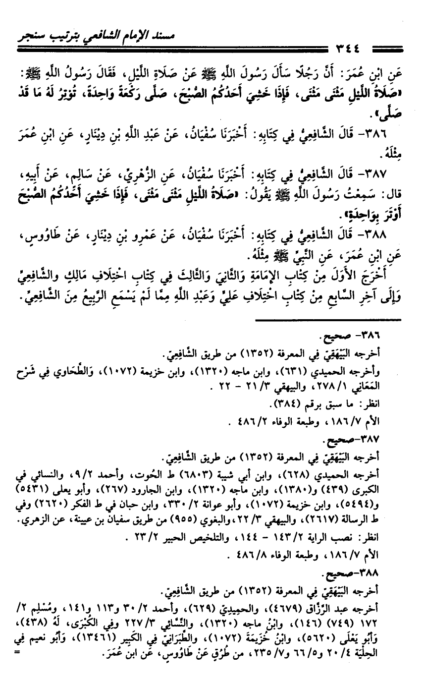 387 - قَالَ الشَّافِعِيُّ فِي كِتَابِهِ: أَخْبَرَنَا سُفْيَانُ، عَنِ الزُّهْرِيِّ، عَنْ سَالِمٍ، عَنْ أَبِيهِ، قَالَ: سَمِعْتُ رَسُولَ اللَّهِ صَلَّى اللَّهُ عَلَيْهِ وَسَلَّمَ يَقُولُ: «صَلاةُ اللَّيْلِ مَثْنَى مَثْنَى، فَإِذَا خَشِيَ أَحَدُكُمُ الصُّبْحَ أَوْتَرَ بِوَاحِدَةٍ» .