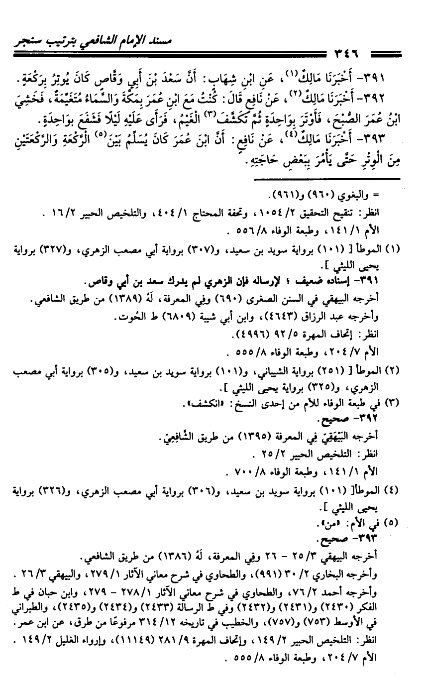 393 - أَخْبَرَنَا مَالِكٌ، عَنْ نَافِعٍ: أَنَّ ابْنَ عُمَرَ كَانَ يُسَلِّمُ بَيْنَ الرَّكْعَةِ وَالرَّكْعَتَيْنِ مِنَ الْوِتْرِ حَتَّى يَأْمُرَ بِبَعْضِ حَاجَتِهِ.