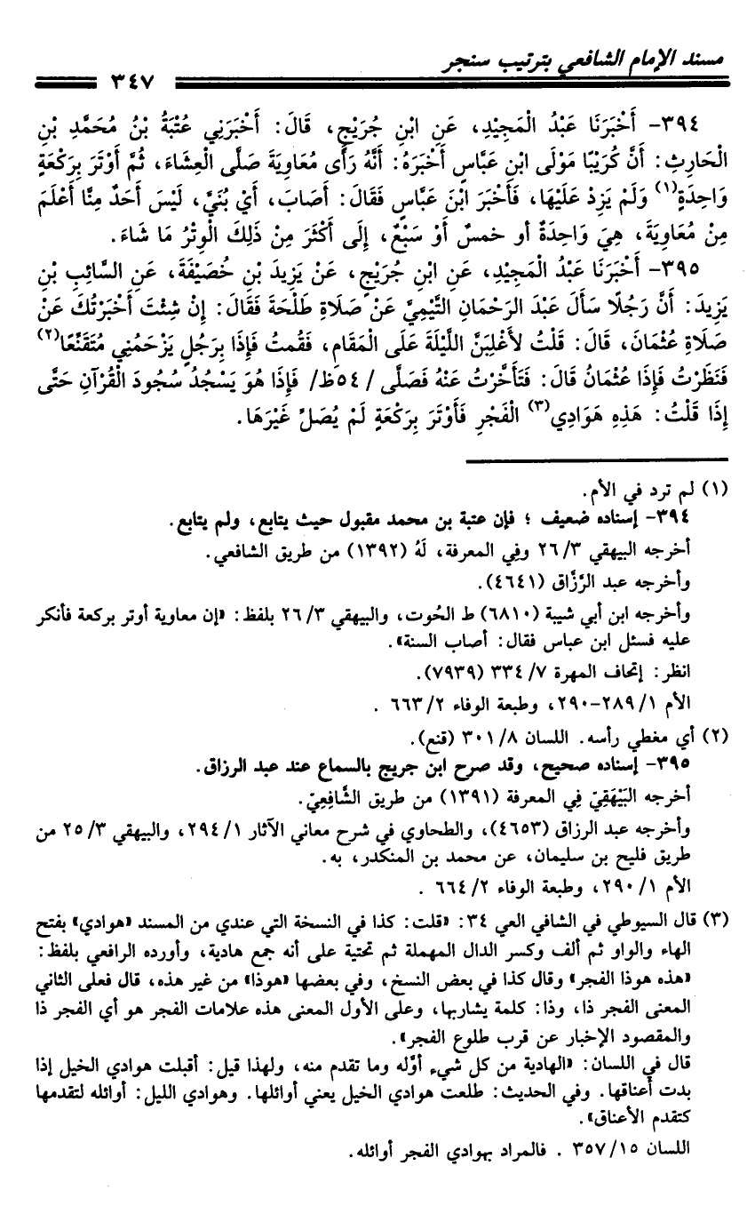 394 - أَخْبَرَنَا عَبْدُ الْمَجِيدِ، عَنِ ابْنِ جُرَيْجٍ، قَالَ: أَخْبَرَنِي عُتْبَةُ بْنُ مُحَمَّدِ بْنِ الْحَارِثِ، أَنَّ كُرَيْبًا مَوْلَى ابْنِ عَبَّاسٍ أَخْبَرَهُ: أَنَّهُ رَأَى مُعَاوِيَةَ صَلَّى الْعِشَاءَ، ثُمَّ أَوْتَرَ بِرَكْعَةٍ وَاحِدَةٍ وَلَمْ يَزِدْ عَلَيْهَا، فَأَخْبَرَ ابْنَ عَبَّاسٍ، فَقَالَ: أَصَابَ، أَيْ بُنَيَّ، لَيْسَ أَحَدٌ مِنَّا أَعْلَمَ مِنْ مُعَاوِيَةَ، هِيَ وَاحِدَةٌ أَوْ خَمْسٌ أَوْ سَبْعٌ، إِلَى أَكْثَرَ مِنْ ذَلِكَ، الْوِتْرُ مَا شَاءَ.