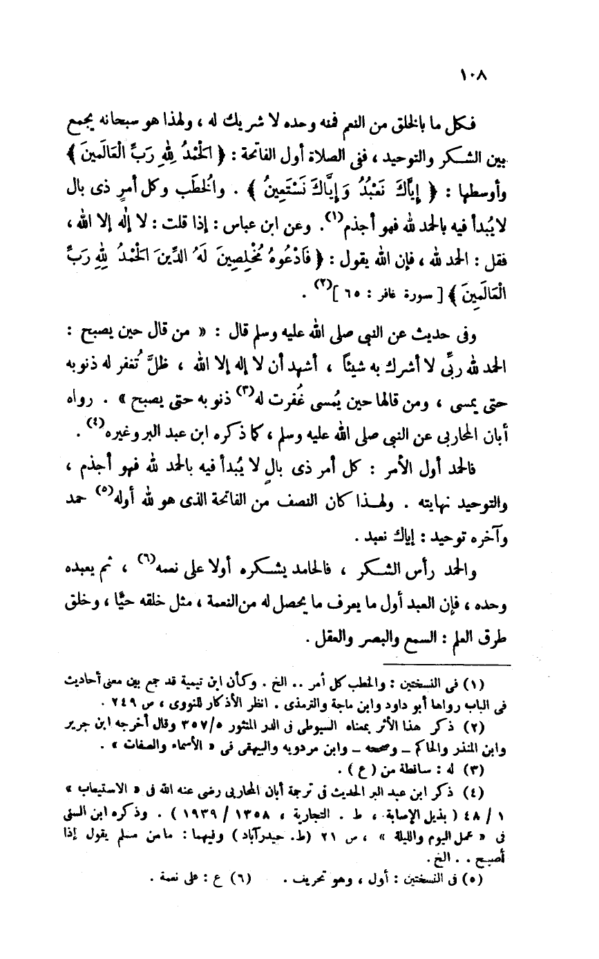 فَكل مَا بالخلق من النعم فَمِنْهُ وَحده لَا شريك لَهُ وَلِهَذَا هُوَ سُبْحَانَهُ يجمع بَين الشُّكْر والتوحيد فَفِي الصَّلَاة أول الْفَاتِحَة الْحَمد لله رب الْعَالمين وأوسطها إياك نعْبد وَإِيَّاك نستعين والخطب وكل أَمر ذِي بَال لَا يبْدَأ فِيهِ بِالْحَمْد لله فَهُوَ أَجْذم وَعَن ابْن عَبَّاس إِذا قلت لَا إِلَه إِلَّا الله فَقل الْحَمد لله فَإِن الله يَقُول فَادعوهُ مُخلصين لَهُ الدَّين الْحَمد لله رب الْعَالمين [سُورَة غَافِر 65]