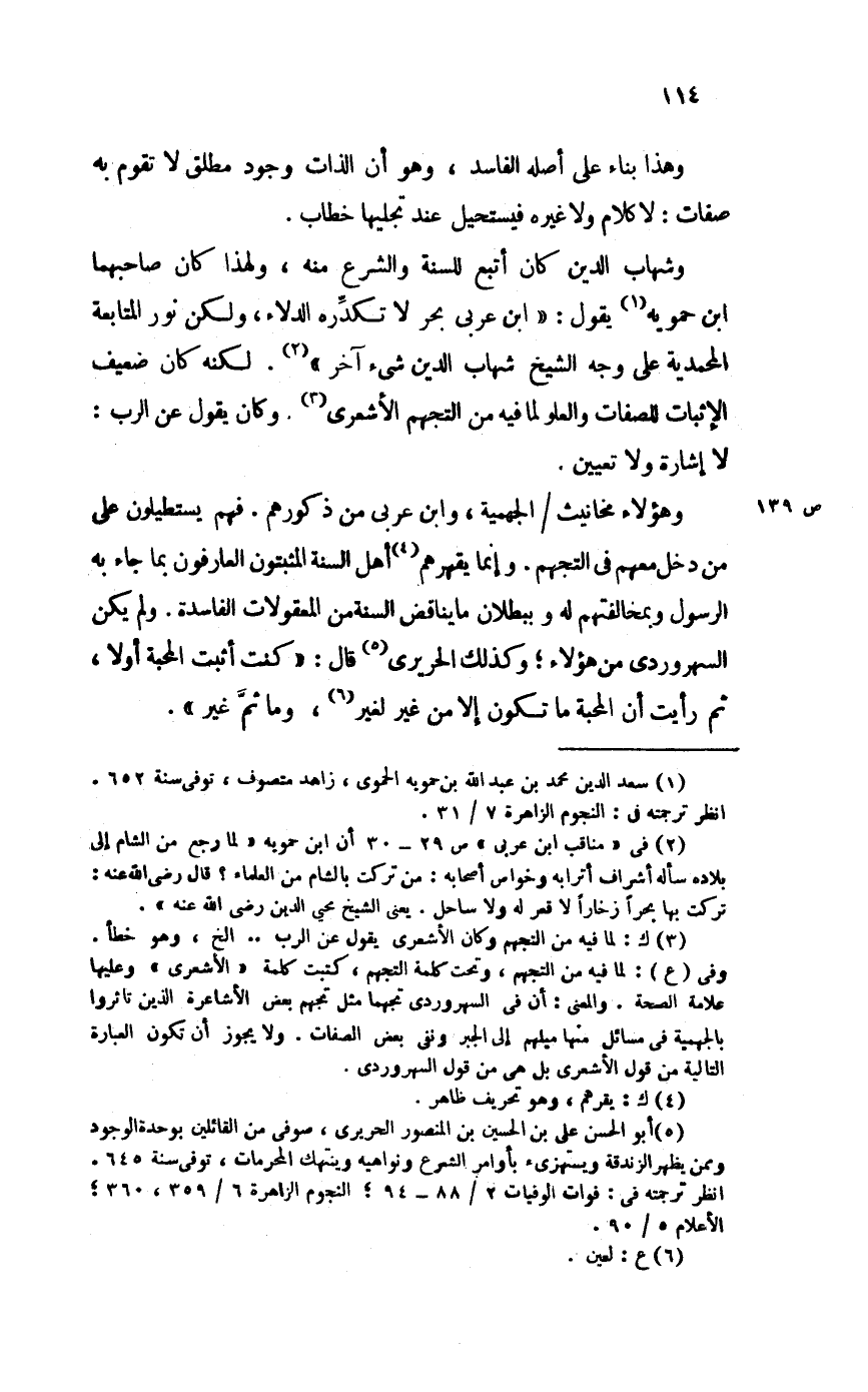 وشهاب الدَّين كَانَ أتبع للسّنة وَالشَّرْع مِنْهُ وَلِهَذَا كَانَ صَاحبهمَا ابْن حمويه يَقُول ابْن عَرَبِيّ بَحر لَا تكدره الدلاء وَلَكِن نور الْمُتَابَعَة المحمدية على وَجه الشَّيْخ شهَاب الدَّين شَيْء آخر لكنه كَانَ ضَعِيف الْإِثْبَات للصفات والعلو لما فِيهِ من التجهم الْأَشْعَرِيّ وَكَانَ يَقُول عَن الرب لَا إِشَارَة وَلَا تعْيين