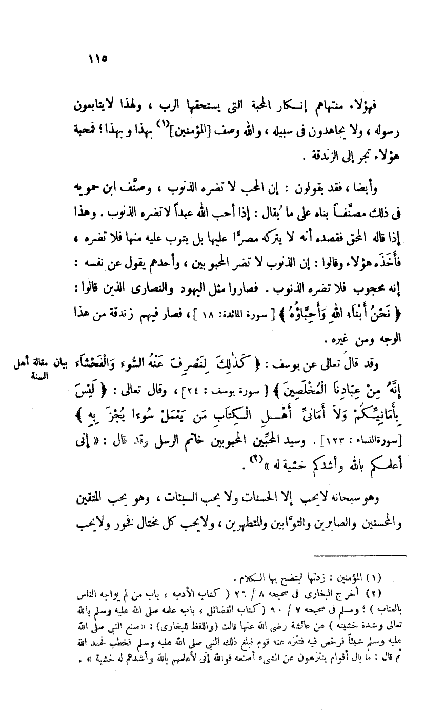 وَقد قَالَ تَعَالَى عَن يُوسُف كَذَلِك لنصرف عَنهُ السوء والفحشاء إِنَّه من عبادنَا المخلصين [سُورَة يُوسُف 24] وَقَالَ تَعَالَى لَيْسَ بأمانيكم وَلَا أماني أهل الْكتاب من يعْمل سوءا يجز بِهِ [سُورَة النِّسَاء 123] وَسيد المحبين المحبوبين خَاتم الرُّسُل وَقد قَالَ إِنِّي أعلمكُم بِاللَّه واشدكم خشيَة لَهُ