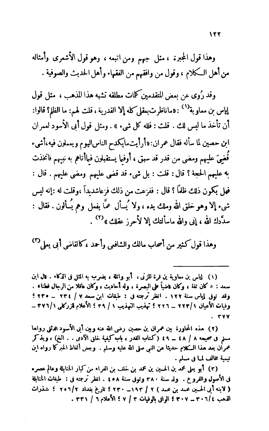 وَقد روى عَن بعض الْمُتَقَدِّمين كَلِمَات مُطلقَة تشبه هَذَا الْمَذْهَب مثل قَول إِيَاس بن مُعَاوِيَة مَا ناظرت بعقلي كُله إِلَّا الْقَدَرِيَّة قلت لَهُم مَا الظُّلم قَالُوا أَن تَأْخُذ مَا لَيْسَ لَك قلت فَللَّه كل شَيْء وَمثل قَول أبي الْأسود لعمران بن حُصَيْن لما سَأَلَهُ فَقَالَ عمرَان أَرَأَيْت مَا يكدح النَّاس الْيَوْم ويعملون فِيهِ أَشَيْء قضى عَلَيْهِم وَمضى من قدر قد سبق أَو فِيمَا يستقبلون فِيمَا أَتَاهُم بِهِ نَبِيّهم فاتخذت بِهِ عَلَيْهِم الْحجَّة قَالَ قلت بل شَيْء قد قضى عَلَيْهِم وَمضى عَلَيْهِم قَالَ فَهَل يكون ذَلِك ظلما قَالَ فَفَزِعت من ذَلِك فَزعًا شَدِيدا وَقلت لَهُ إِنَّه لَيْسَ شَيْء إِلَّا وَهُوَ خلق الله وَملك يَده وَلَا يسْأَل عَمَّا يفعل وهم يسْأَلُون فَقَالَ سددك الله إِنِّي وَالله مَا سَأَلتك إِلَّا لأحرز عقلك