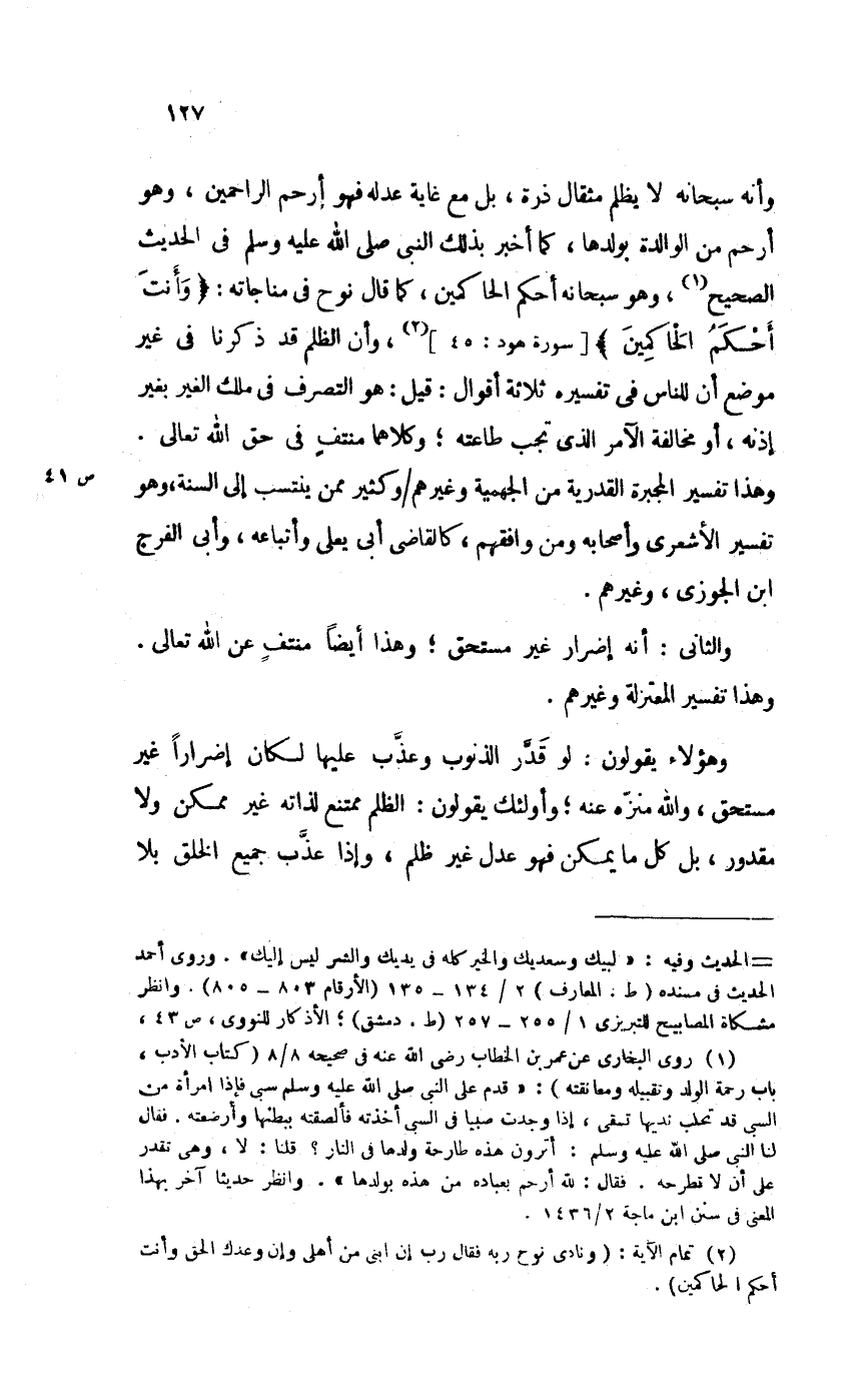 وَأَنه سُبْحَانَهُ لَا يظلم مِثْقَال ذرة بل مَعَ غَايَة عدله فَهُوَ أرْحم الرَّاحِمِينَ وَهُوَ أرْحم من الوالدة بِوَلَدِهَا كَمَا أخبر بذلك النَّبِي صلى الله عَلَيْهِ وَسلم فِي الحَدِيث الصَّحِيح وَهُوَ سُبْحَانَهُ أحكم الْحَاكِمين كَمَا قَالَ نوح فِي مناجاته وَأَنت أحكم الْحَاكِمين [سُورَة هود 45] وَأَن الظُّلم قد ذكرنَا فِي غير مَوضِع أَن للنَّاس فِي تَفْسِيره ثَلَاثَة أَقْوَال قيل هُوَ التَّصَرُّف فِي ملك الْغَيْر بِغَيْر إِذْنه أَو مُخَالفَة الْآمِر الَّذِي تجب طَاعَته وَكِلَاهُمَا مُنْتَفٍ فِي حق الله تَعَالَى وَهَذَا تَفْسِير الْمُجبرَة الْقَدَرِيَّة من الْجَهْمِية وَغَيرهم وَكثير مِمَّن ينتسب إِلَى السّنة وَهُوَ تَفْسِير الْأَشْعَرِيّ وَأَصْحَابه وَمن وافقهم كَالْقَاضِي أبي يعلى وَأَتْبَاعه وَأبي الْفرج ابْن الْجَوْزِيّ وَغَيرهم