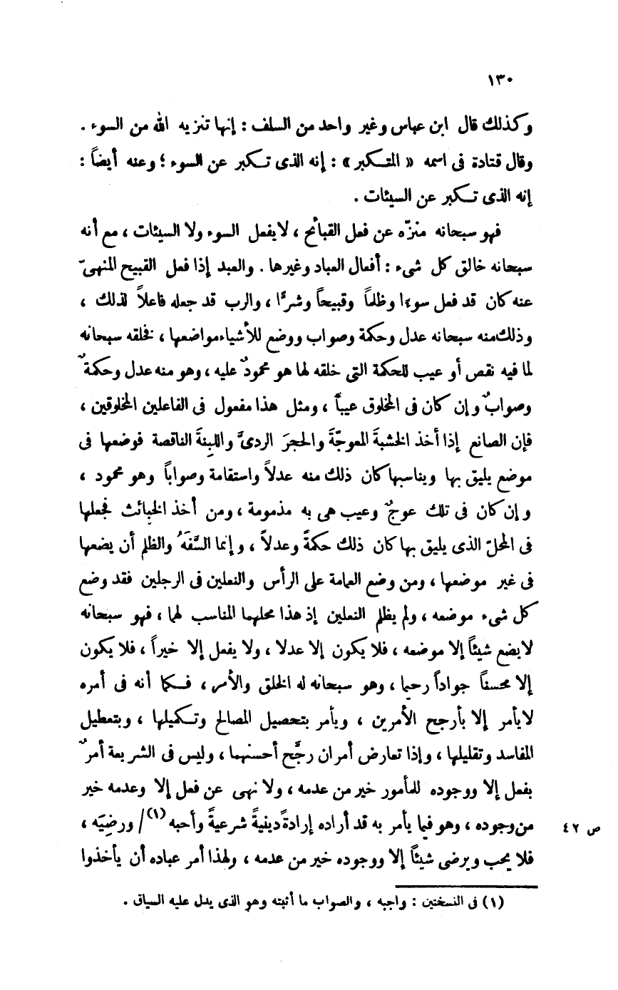 وَكَذَلِكَ قَالَ ابْن عَبَّاس وَغير وَاحِد من السّلف إِنَّهَا تَنْزِيه الله من السوء وَقَالَ قَتَادَة فِي اسْمه المتكبر إِنَّه الَّذِي تكبر عَن السوء وَعنهُ أَيْضا إِنَّه الَّذِي تكبر عَن السَّيِّئَات