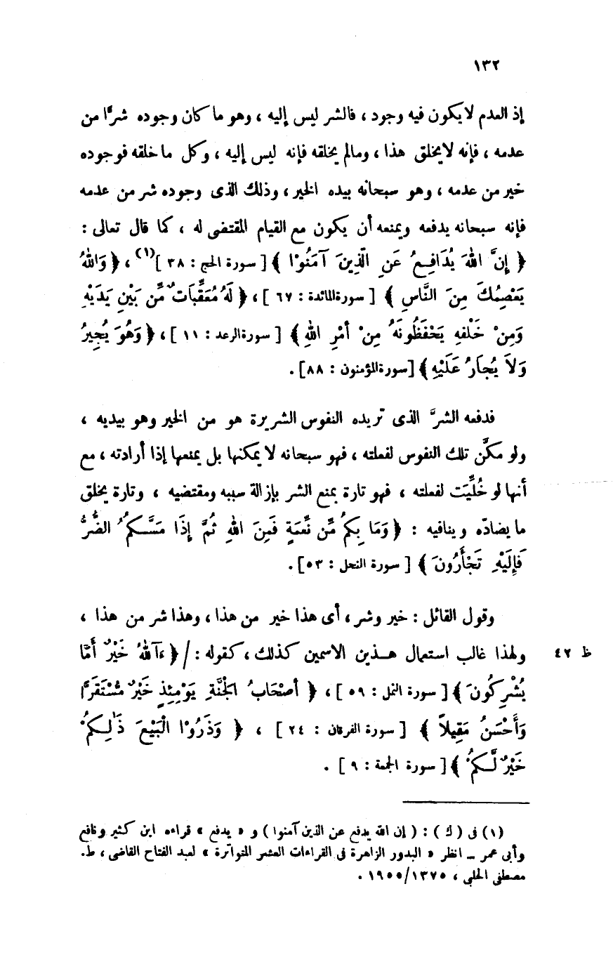إِذْ الْعَدَم لَا يكون فِيهِ وجود فالشر لَيْسَ إِلَيْهِ وَهُوَ مَا كَانَ وجوده شرا من عَدمه فَإِنَّهُ لَا يخلق هَذَا وَمَا لم يخلقه فَإِنَّهُ لَيْسَ إِلَيْهِ وكل مَا خلقه فوجوده خير من عَدمه وَهُوَ سُبْحَانَهُ بِيَدِهِ الْخَيْر وَذَلِكَ الَّذِي وجوده شَرّ من عَدمه فَإِنَّهُ سُبْحَانَهُ يَدْفَعهُ ويمنعه أَن يكون مَعَ الْقيام الْمُقْتَضِي لَهُ كَمَا قَالَ تَعَالَى إِن الله يدافع عَن الَّذين آمنُوا [سُورَة الْحَج 38] وَالله يَعْصِمك من النَّاس [سُورَة الْمَائِدَة 67] لَهُ مُعَقِّبَات من بَين يَدَيْهِ وَمن خَلفه يَحْفَظُونَهُ من أَمر الله [سُورَة الرَّعْد 11] وَهُوَ يجير وَلَا يجار عَلَيْهِ [سُورَة الْمُؤْمِنُونَ 88]