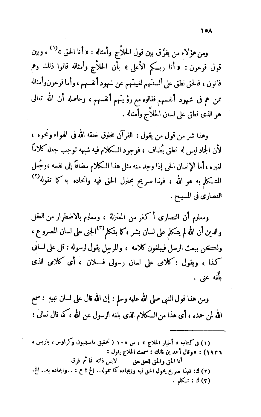 وَهَذَا شَرّ من قَول من يَقُول الْقُرْآن مَخْلُوق خلقه الله فِي الْهَوَاء وَنَحْوه لِأَن الجماد لَيْسَ لَهُ نطق يُضَاف إِلَيْهِ فوجود الْكَلَام فِيهِ شُبْهَة توجب جعله كلَاما لغيره أما الْإِنْسَان الْحَيّ إِذا وجد مِنْهُ مثل هَذَا الْكَلَام مُضَافا إِلَى نَفسه وَجعل الْمُتَكَلّم بِهِ هُوَ الله فَهَذَا صَرِيح بحلول الْحق فِيهِ واتحاده بِهِ كَمَا تَقوله النَّصَارَى فِي الْمَسِيح