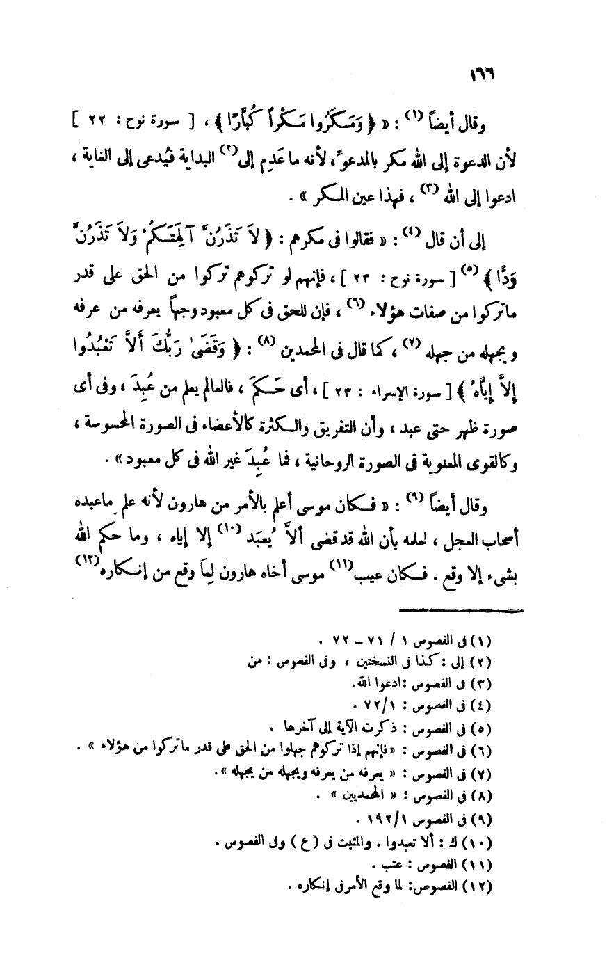 إِلَى أَن قَالَ فَقَالُوا فِي مَكْرهمْ لَا تذرن آلِهَتكُم وَلَا تذرن ودا [سُورَة نوح 23] فَإِنَّهُم لَو تركوهم تركُوا من الْحق على قدر مَا تركُوا من صِفَات هَؤُلَاءِ فَإِن للحق فِي كل معبود وَجها يعرفهُ من عرفه ويجهله من جَهله كَمَا قَالَ فِي المحمدين وَقضى رَبك أَلا تعبدوا إِلَّا إِيَّاه [سُورَة الْإِسْرَاء 23] أَي حكم فالعالم يعلم من عبد وَفِي أَي صُورَة ظهر حَتَّى عبد وَأَن التَّفْرِيق وَالْكَثْرَة كالأعضاء فِي الصُّورَة المحسوسة وكالقوى المعنوية فِي الصُّورَة الروحانية فَمَا عبد غير الله فِي كل معبود
