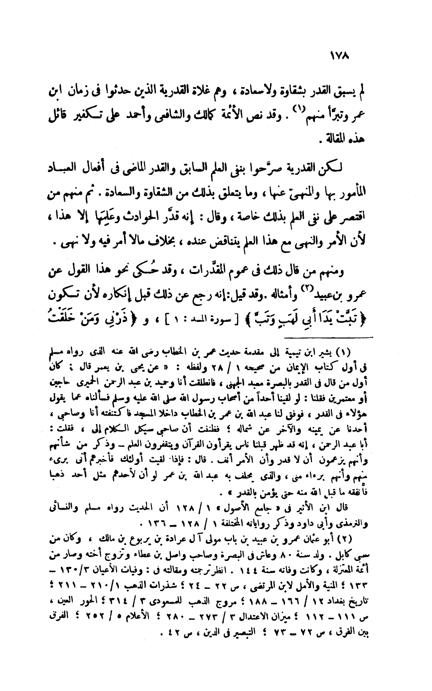 لَكِن الْقَدَرِيَّة صَرَّحُوا بِنَفْي الْعلم السَّابِق وَالْقدر الْمَاضِي فِي أَفعَال الْعباد الْمَأْمُور بهَا والمنهي عَنْهَا وَمَا يتَعَلَّق بذلك من الشقاوة والسعادة ثمَّ مِنْهُم من اقْتصر على نفي الْعلم بذلك خَاصَّة وَقَالَ إِنَّه قدر الْحَوَادِث وَعلمهَا إِلَّا هَذَا لِأَن الْأَمر وَالنَّهْي مَعَ هَذَا الْعلم يتناقض عِنْده بِخِلَاف مَا لَا أَمر فِيهِ وَلَا نهي