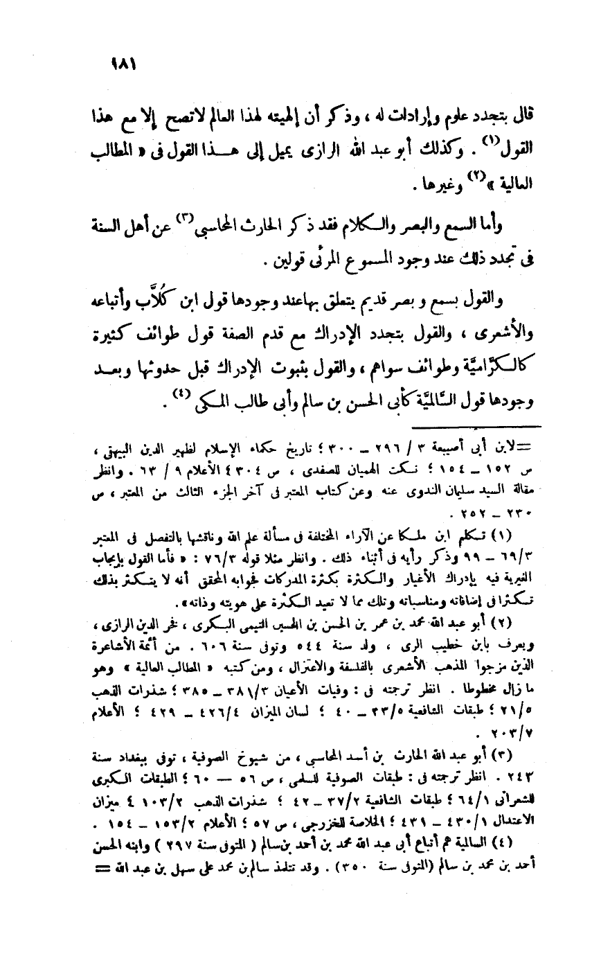 قَالَ بتجدد عُلُوم وإرادات لَهُ وَذكر أَن إلهيته لهَذَا الْعَالم لَا تصح إِلَّا مَعَ هَذَا القَوْل وَكَذَلِكَ أَبُو عبد الله الرَّازِيّ يمِيل إِلَى هَذَا القَوْل فِي المطالب الْعَالِيَة وَغَيرهَا
