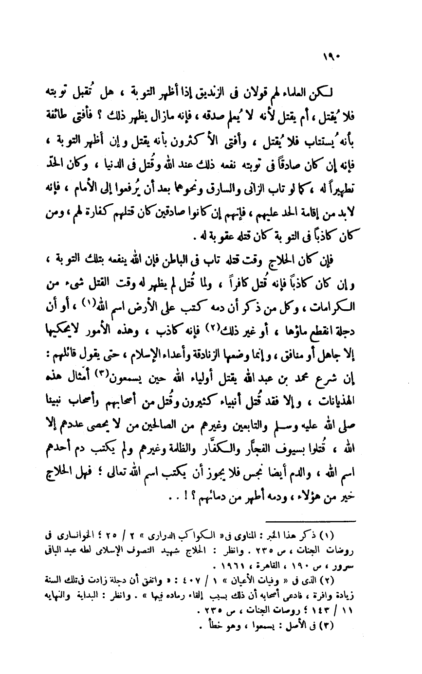 فَإِن كَانَ الحلاج وَقت قَتله تَابَ فِي الْبَاطِن فَإِن الله يَنْفَعهُ بِتِلْكَ التَّوْبَة، وَإِن كَانَ كَاذِبًا فَإِنَّهُ قتل كَافِرًا، وَلما قُتل لم يظْهر لَهُ وَقت الْقَتْل شَيْء من الكرامات، وكل من ذكر أَن دَمه كتب على الأَرْض اسْم الله، أَو أَن دجلة انْقَطع مَاؤُهَا، أَو غير ذَلِك، فَإِنَّهُ كَاذِب، وَهَذِه الْأُمُور لَا يحكيها إِلَّا جَاهِل أَو مُنَافِق، وَإِنَّمَا وَضعهَا الزَّنَادِقَة وأعداء الْإِسْلَام، حَتَّى يَقُول قَائِلهمْ: إِن شرع مُحَمَّد بن عبد الله يقتل أَوْلِيَاء الله حِين يسمعُونَ أَمْثَال هَذِه الهذيانات، وَإِلَّا فقد قتل أَنْبيَاء كَثِيرُونَ وَقتل من أَصْحَابهم وَأَصْحَاب نَبينَا صلى الله عَلَيْهِ وَسلم وَالتَّابِعِينَ وَغَيرهم من الصَّالِحين من لَا يحصي عَددهمْ إِلَّا الله، قتلوا بسيوف الْفجار وَالْكفَّار والظلمة وَغَيرهم وَلم يكْتب دم أحدهم اسْم الله، وَالدَّم أَيْضا نجس فَلَا يجوز أَن يكْتب اسْم الله تَعَالَى؛ فَهَل الحلاج خير من هَؤُلَاءِ، وَدَمه أطهر من دِمَائِهِمْ؟!