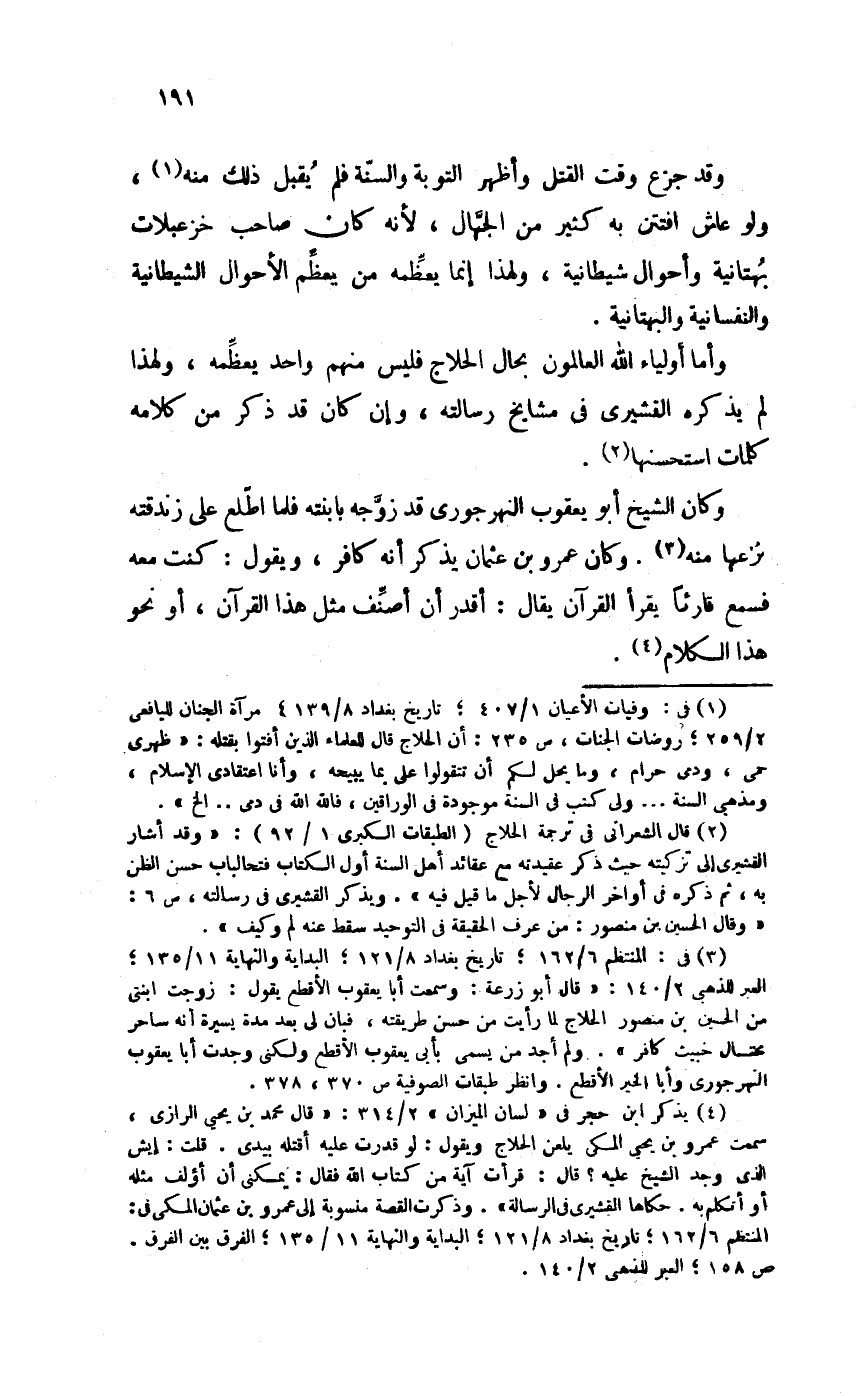 وَأما أَوْلِيَاء الله الْعَالمُونَ بِحَال الحلاج فَلَيْسَ مِنْهُم وَاحِد يعظمه، وَلِهَذَا لم يذكرهُ الْقشيرِي فِي مَشَايِخ رسَالَته، وَإِن كَانَ قد ذكر من كَلَامه كَلِمَات استحسنها.