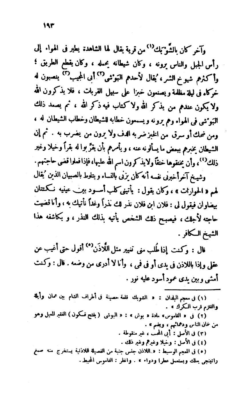 وَآخر كَانَ بالشَّوْبَك من قَرْيَة يُقَال لَهَا (الشاهدة) يطير فِي الْهَوَاء إِلَى رَأس الْجَبَل وَالنَّاس يرونه، وَكَانَ شَيْطَانه يحملهُ، وَكَانَ يقطع الطَّرِيق؛ وَأَكْثَرهم شُيُوخ الشَّرّ، يُقَال لأَحَدهم البَوْشي أبي الْمُجيب ينصبون لَهُ خركاه فِي لَيْلَة مظْلمَة ويصنعون خبْزًا على سَبِيل القربات، فَلَا يذكرُونَ الله وَلَا يكون عِنْدهم من يذكر الله وَلَا كتاب فِيهِ ذكر الله، ثمَّ يصعد ذَلِك البَوْشي فِي الْهَوَاء وهم يرونه ويسمعون خطابه للشَّيْطَان وخطاب الشَّيْطَان لَهُ، وَمن ضحك أَو سرق من الْخبز ضربه الدُّف وَلَا يرَوْنَ من يضْرب بِهِ. ثمَّ إِن الشَّيْطَان يُخْبِرهُمْ بِبَعْض مَا يسألونه عَنهُ، وَيَأْمُرهُمْ بِأَن يقربُوا لَهُ بقرًا وخيلاً وَغير ذَلِك، وَأَن يخنقوها خنقًا وَلَا يذكرُونَ اسْم الله عَلَيْهَا، فَإِذا فعلوا قضى حَاجتهم.