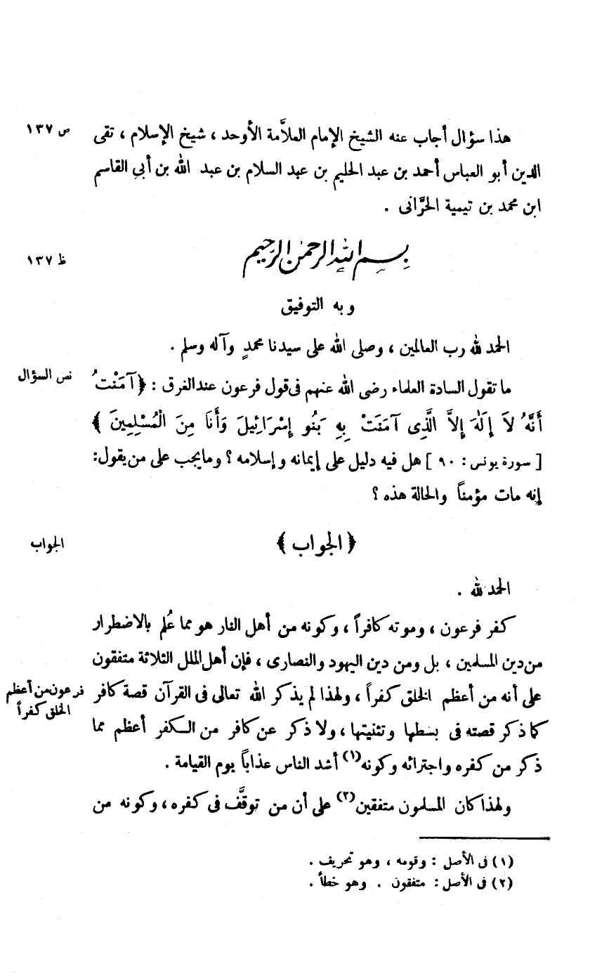 هَذَا سُؤال أجَاب عَنهُ الشَّيْخ الإِمَام الْعَلامَة الأوحد، شيخ الْإِسْلَام، تَقِيّ الدَّين أَبُو الْعَبَّاس أَحْمد بن عبد الْحَلِيم بن عبد السَّلَام بن عبد الله بن أبي الْقَاسِم بن مُحَمَّد بن تَيْمِية الْحَرَّانِي.