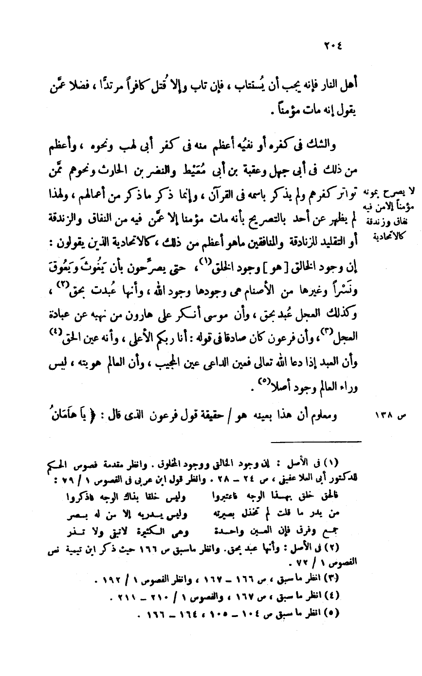 وَالشَّكّ فِي كفره أَو نَفْيه أعظم مِنْهُ فِي كفر أبي لَهب وَنَحْوه، وَأعظم من ذَلِك فِي أبي جهل وَعقبَة بن أبي معيط وَالنضْر بن الْحَارِث وَنَحْوهم مِمَّن تَوَاتر كفرهم وَلم يذكر باسمه فِي الْقُرْآن، وَإِنَّمَا ذكر مَا ذكر من أَعْمَالهم، وَلِهَذَا لم يظْهر عَن أحد بالتصريح بِأَنَّهُ مَاتَ مُؤمنا إِلَّا عَمَّن فِيهِ من النِّفَاق والزندقة أَو التَّقْلِيد للزنادقة وَالْمُنَافِقِينَ مَا هُوَ أعظم من ذَلِك، كالإتحادية الَّذين يَقُولُونَ: إِن وجود الْخَالِق هُوَ وجود الْخلق، حَتَّى يصرحون بِأَن يَغُوث ويعوق ونسرا وَغَيرهَا من الْأَصْنَام هِيَ وجودهَا وجود الله، وَأَنَّهَا عبدت بِحَق، وَكَذَلِكَ الْعجل عبد بِحَق، وَأَن مُوسَى أنكر على هَارُون من نَهْيه عَن عبَادَة الْعجل، وَأَن فِرْعَوْن كَانَ صَادِقا فِي قَوْله: أَنا ربكُم الْأَعْلَى، وَأَنه عين الْحق، وَأَن العَبْد إِذا دَعَا الله تَعَالَى فعين الدَّاعِي عين الْمُجيب، وَأَن الْعَالم هويته، لَيْسَ وَرَاء الْعَالم وجود أصلا.