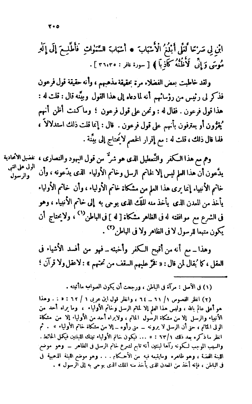 وَلَقَد خاطبت بعض الْفُضَلَاء مرّة بِحَقِيقَة مَذْهَبهم، وَأَنه حَقِيقَة قَول فِرْعَوْن فَذكر لي رَئِيس من رُؤَسَائِهِمْ أَنه لما دَعَاهُ إِلَى هَذَا القَوْل وَبَينه قَالَ: قلت لَهُ: هَذَا قَول فِرْعَوْن. فَقَالَ لَهُ: وَنحن على قَول فِرْعَوْن؛ وَمَا كنت أَظن أَنهم يقرونَ أَو يعترفون بِأَنَّهُم على قَول فِرْعَوْن. قَالَ: إِنَّمَا قلت ذَلِك اسْتِدْلَالا، فَلَمَّا قَالَ ذَلِك، قلت لَهُ: مَعَ إِقْرَار الْخصم لَا يحْتَاج إِلَى بَيِّنَة.