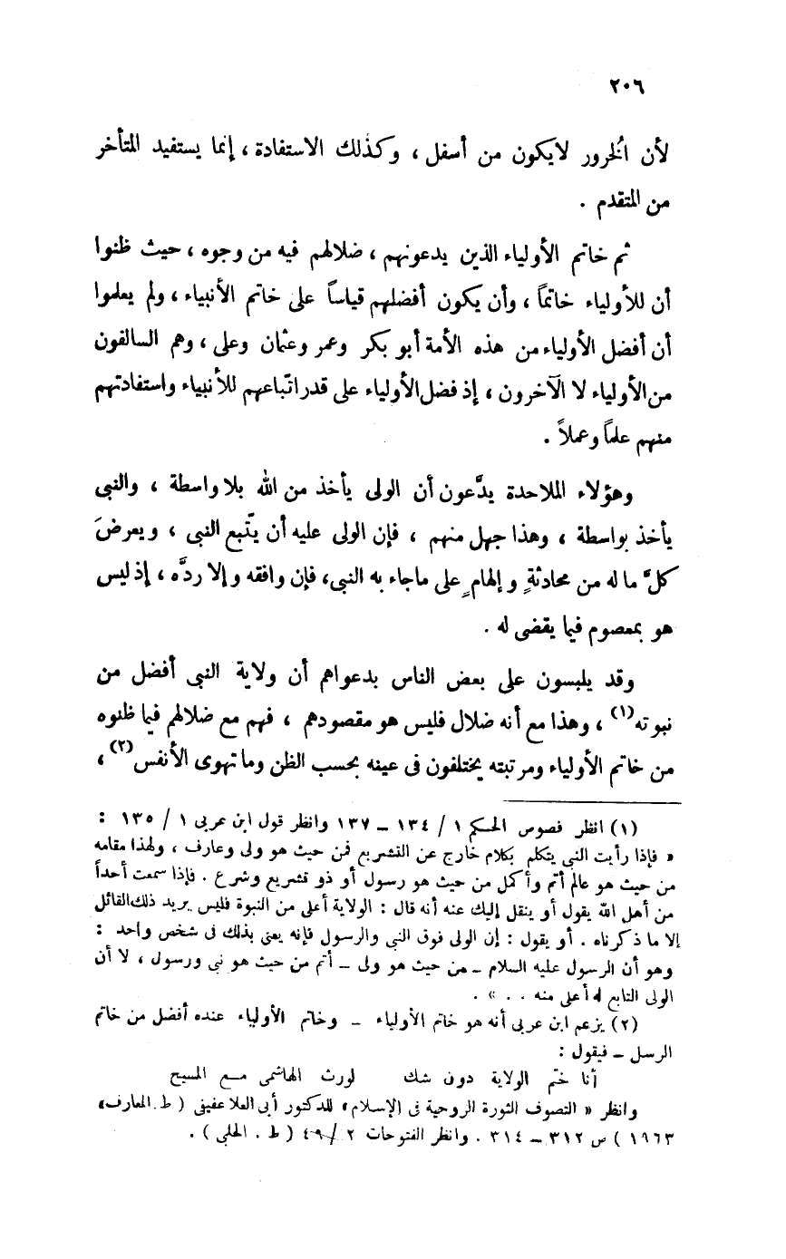 وَهَؤُلَاء الْمَلَاحِدَة يدعونَ أَن الْوَلِيّ يَأْخُذ من الله بِلَا وَاسِطَة، وَالنَّبِيّ يَأْخُذ بِوَاسِطَة، وَهَذَا جهل مِنْهُم، فَإِن الْوَلِيّ عَلَيْهِ أَن يتبع النَّبِي، ويعرض كل مَا لَهُ من محادثة وإلهام على مَا جَاءَ بِهِ النَّبِي، فَإِن وَافقه وَإِلَّا رده، إِذْ لَيْسَ هُوَ بمعصوم فِيمَا يقْضِي لَهُ.