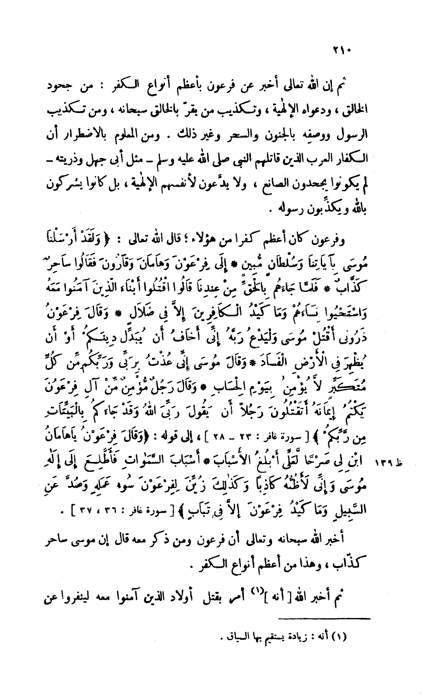ثمَّ إِن الله تَعَالَى أخبر عَن فِرْعَوْن بأعظم أَنْوَاع الْكفْر: من جحود الْخَالِق، ودعواه الإلهية، وَتَكْذيب من يقر بالخالق سُبْحَانَهُ، وَمن تَكْذِيب الرَّسُول وَوَصفه بالجنون وَالسحر وَغير ذَلِك. وَمن الْمَعْلُوم بالاضطرار أَن الْكفَّار الْعَرَب الَّذين قَاتلهم النَّبِي صلى الله عَلَيْهِ وَسلم -مثل أبي جهل وَذريته- لم يَكُونُوا يجحدون الصَّانِع، وَلَا يدعونَ لأَنْفُسِهِمْ الإلهية، بل كَانُوا يشركُونَ بِاللَّه ويكذبون رَسُوله.